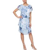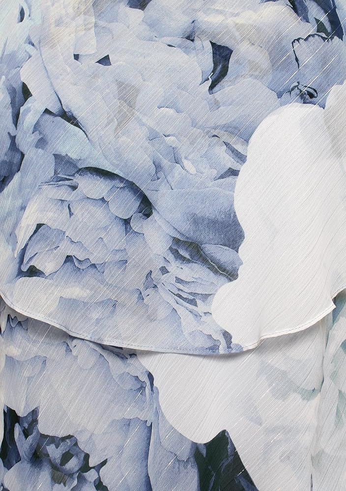 Floral Glamour: Scoop neck, split cape short sleeves, and multi-tiered design accentuated by a crystal-beaded pin. Embrace a feminine and stylish appearance with a blue ground floral print.