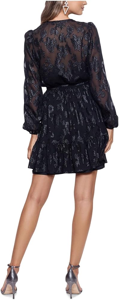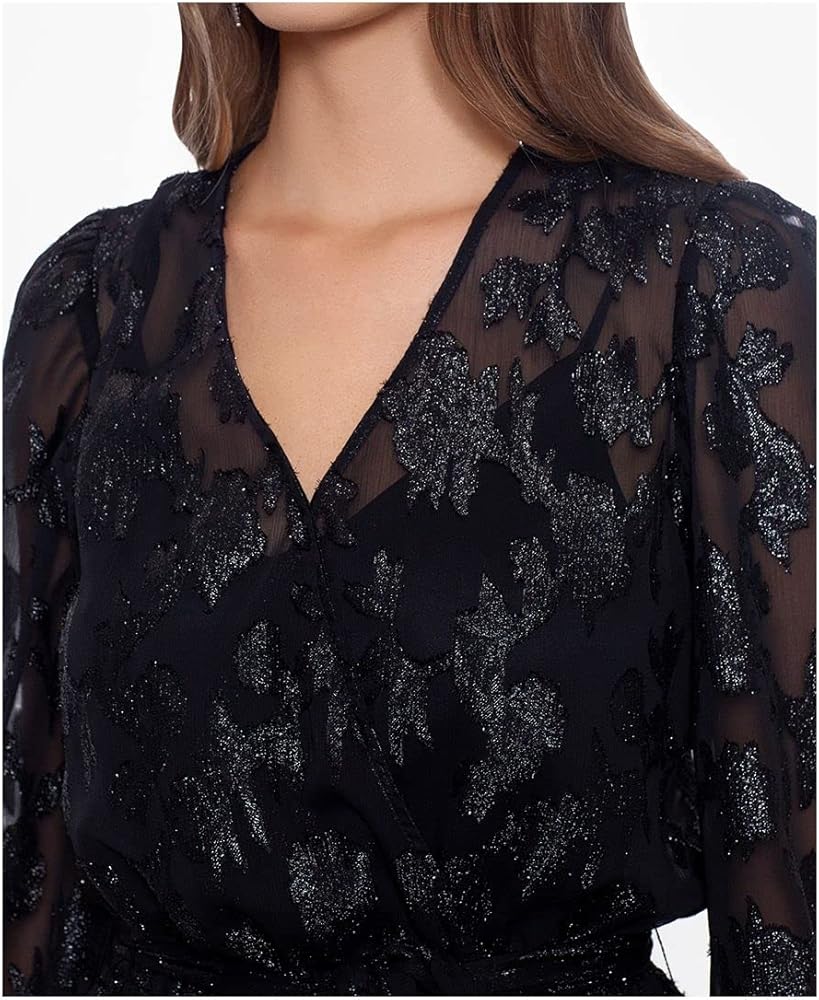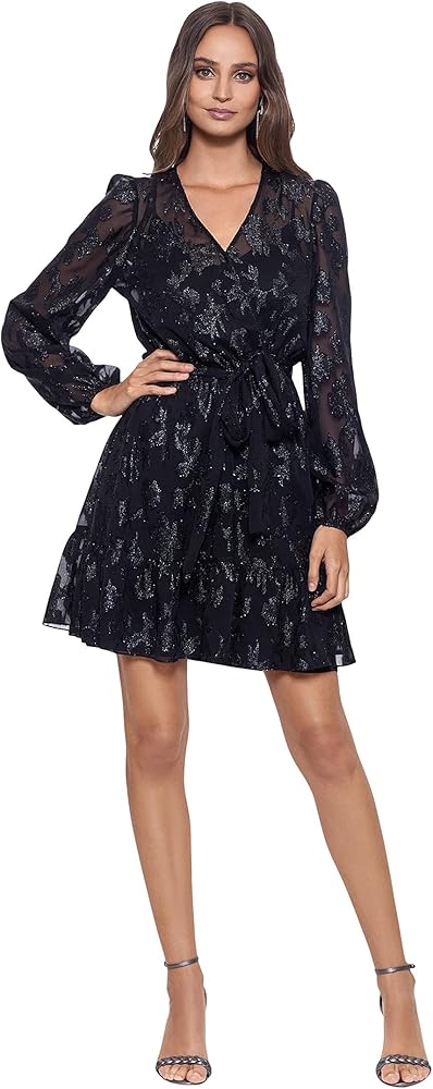 The Betsy & Adam™ Short Long Sleeve Burnout Dress features a V-neckline, long blouson sleeves and allover embroidery to add a little flair to evening look. Easy pullover styling with a ruffled hemline that falls above the knee.