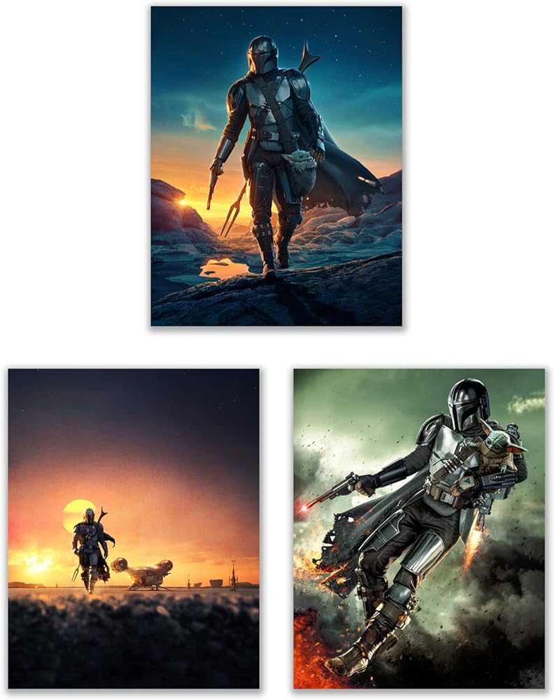 ملصقات BigWigPrints Mandalorian - ملصق Star Wars Mandalorian، فن من الموسم الأول والثاني والثالث - مجموعة من 3 (11x14) لوحات فنية جدارية Mandalorian، Baby Grogu وPedro Pascal في دور Mando