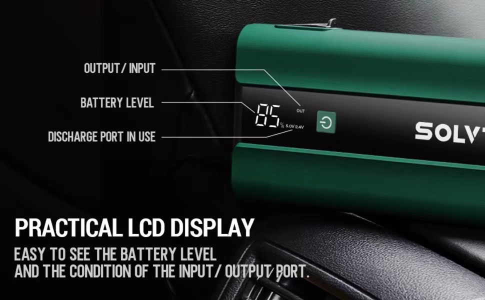 شاشة LCD مطورة: من خلال شاشة LCD، يمكنك رؤية حالة الاستخدام والكهرباء المتبقية في مشغل السيارة بوضوح. كن مناسبًا لك لاختيار منفذ الشحن الذي تحتاجه والتحقق من الشحن والتفريغ.
