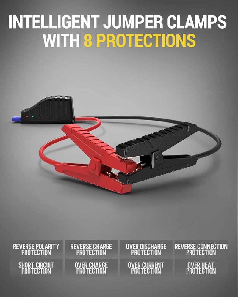 حماية ذكية وآمنة: 8 أنظمة حماية (القطبية العكسية، الشحن العكسي، التفريغ الزائد، الاتصال العكسي، ماس كهربائى، الشحن الزائد، التيار الزائد، الحرارة الزائدة) لكابل القفز يضمن سلامتك أثناء القفز. يوضح المؤشر الأحمر/الأخضر ما إذا تم استخدامه بشكل صحيح.