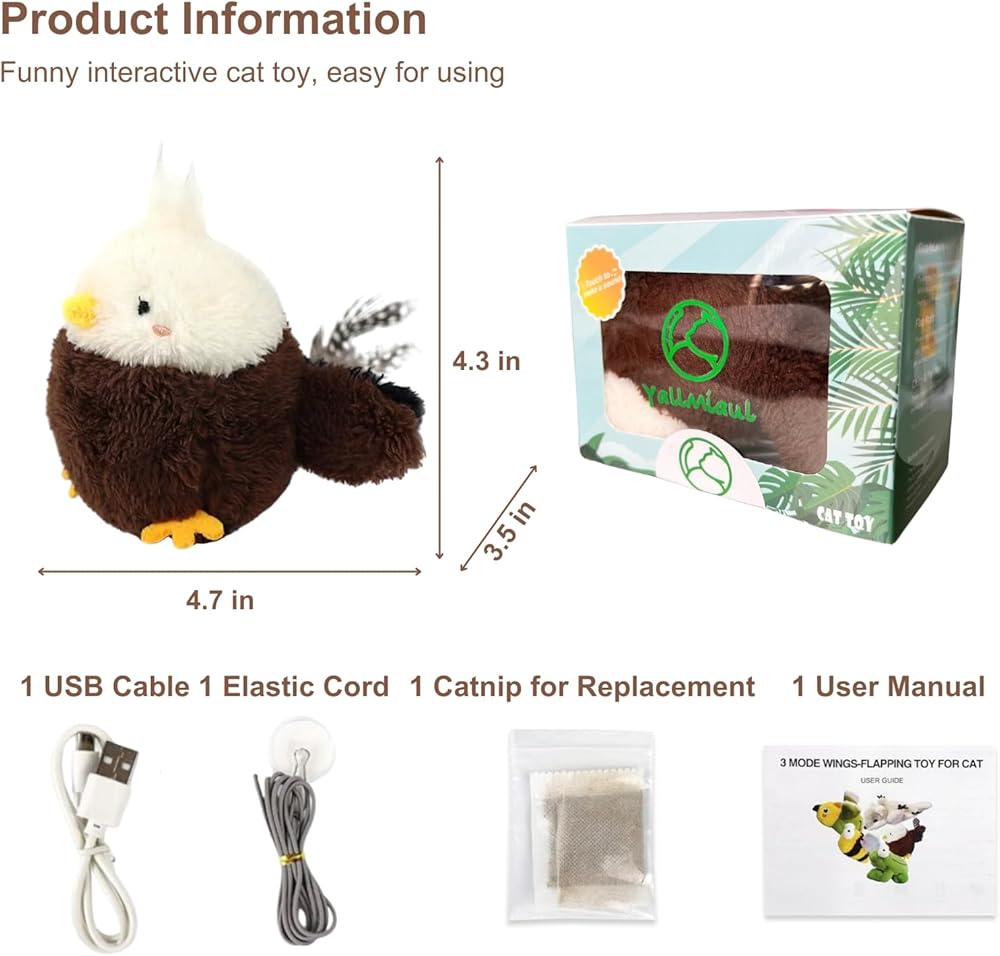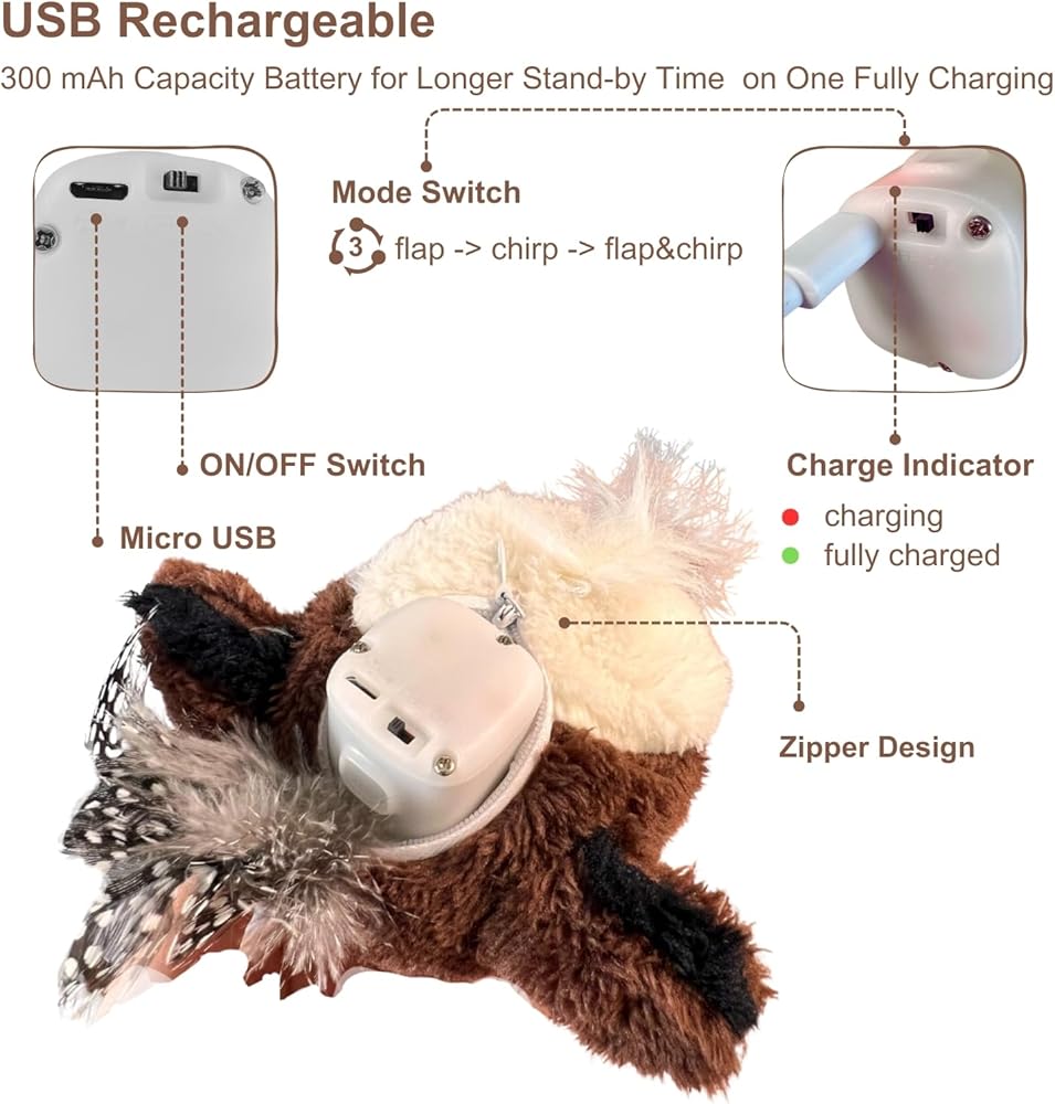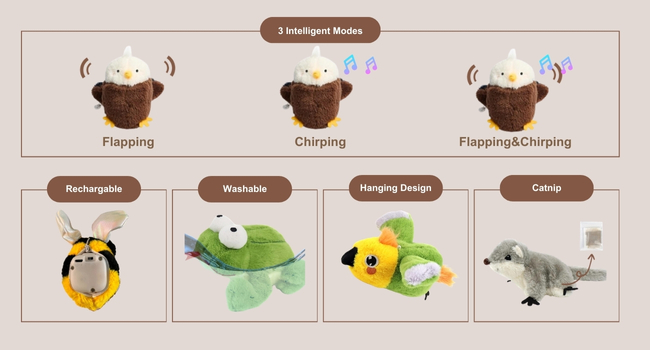 3 أوضاع للإثارة - هناك 3 أوضاع لتلبية احتياجات القطط المختلفة. إنهم يرفرفون ويغردون ويرفرفون ويغردون. إيقاف تشغيل وضع النقيق، لن يزعجك في الليل. سيتم تفعيل لمسة واحدة تلقائيًا لمدة 15 ثانية