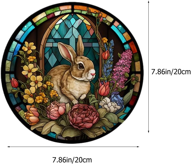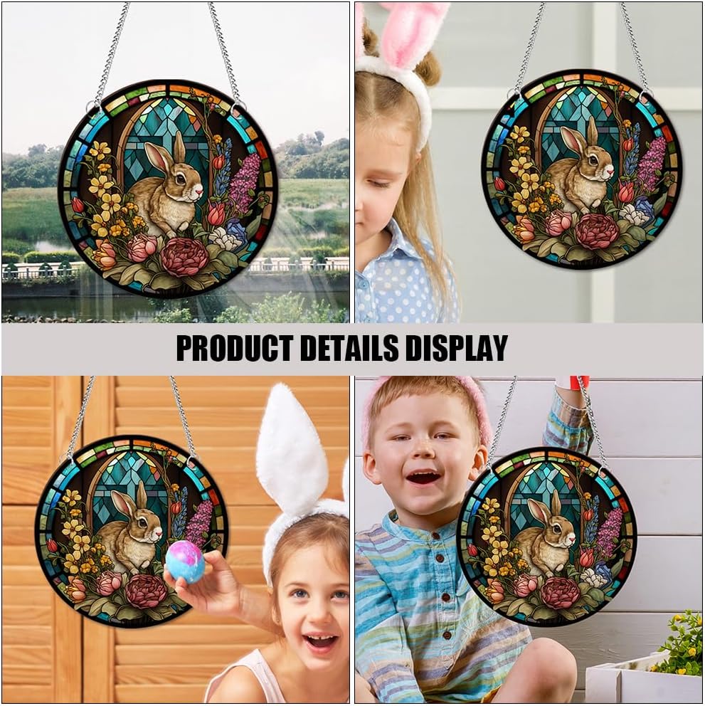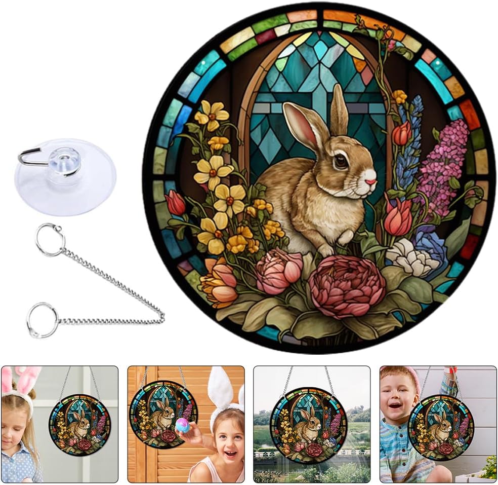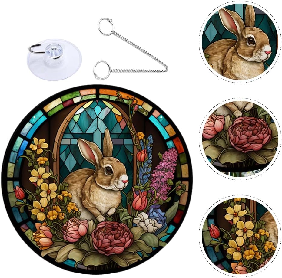 • 🐇🐇 Easter Stained Hanging Ornament Acrylic Easter Bunny Signs Double Sided Easter Stained Pendant Round Easter Rabbit Plaques with Chains Suction Hook for Garden Home