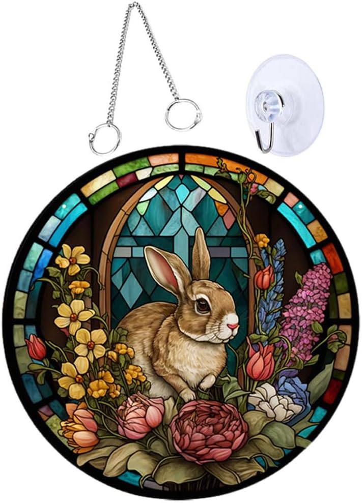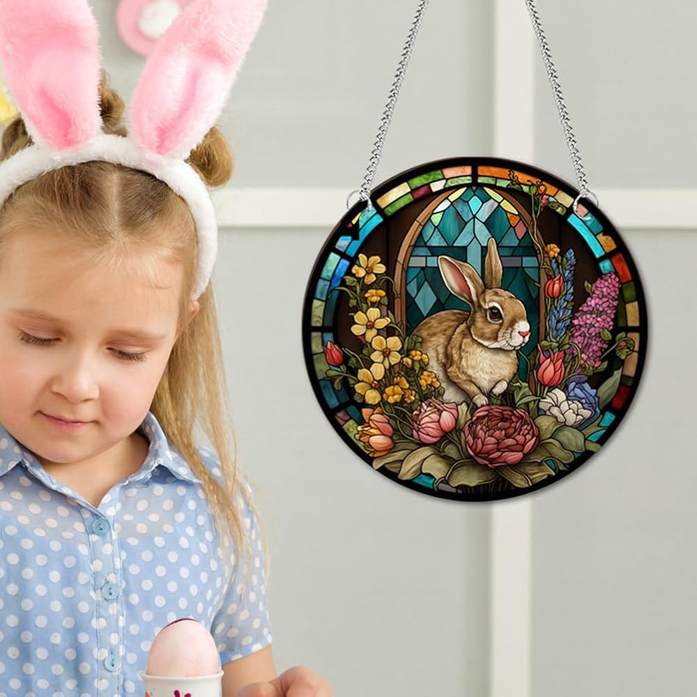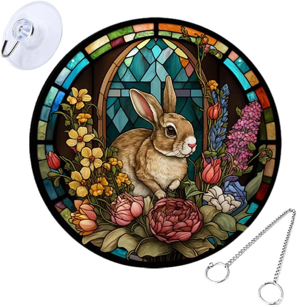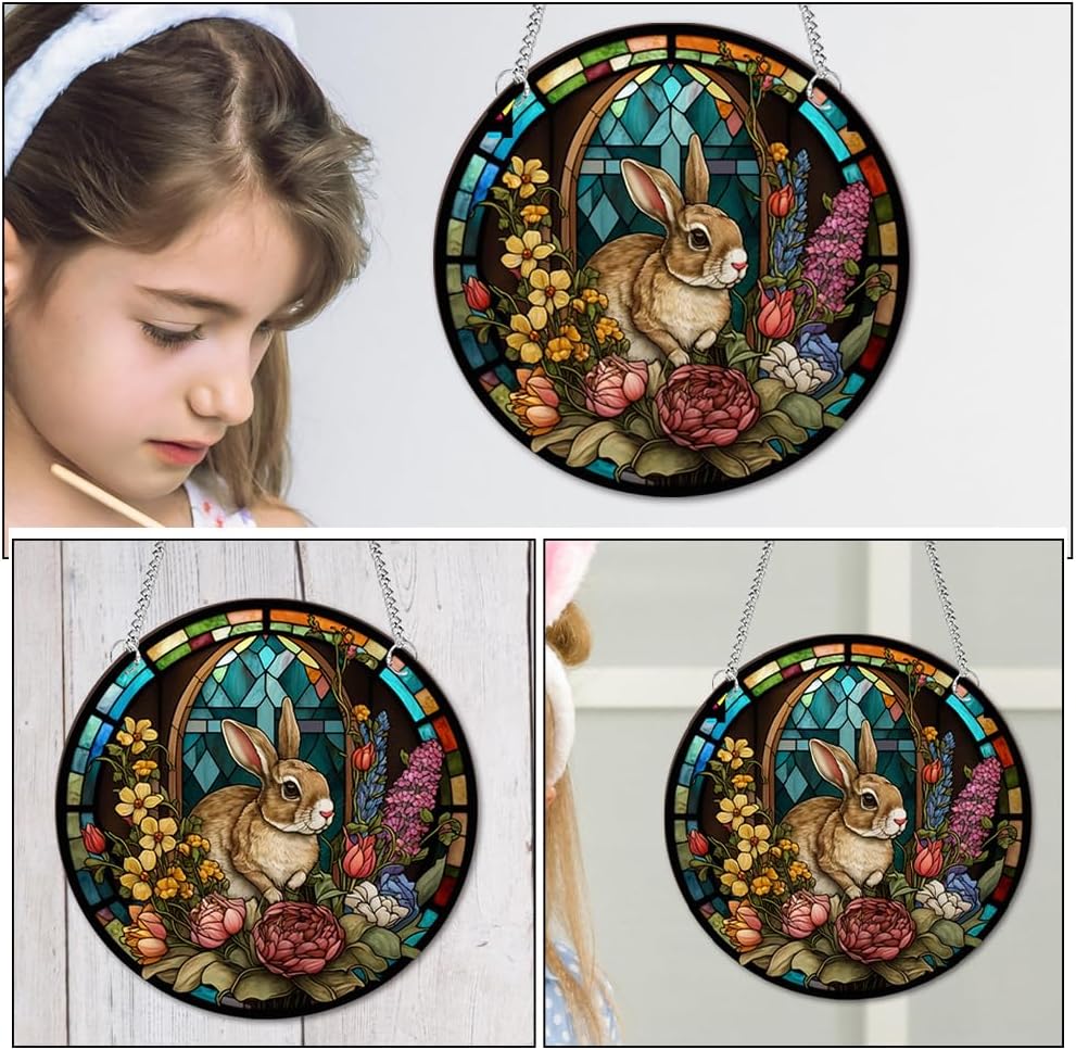 • 🐇🐇 Easter Stained Hanging Ornament Acrylic Easter Bunny Signs Double Sided Easter Stained Pendant Round Easter Rabbit Plaques with Chains Suction Hook for Garden Home