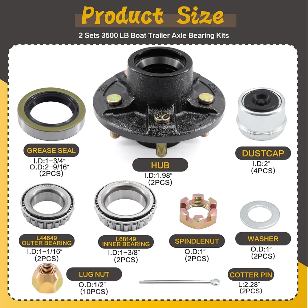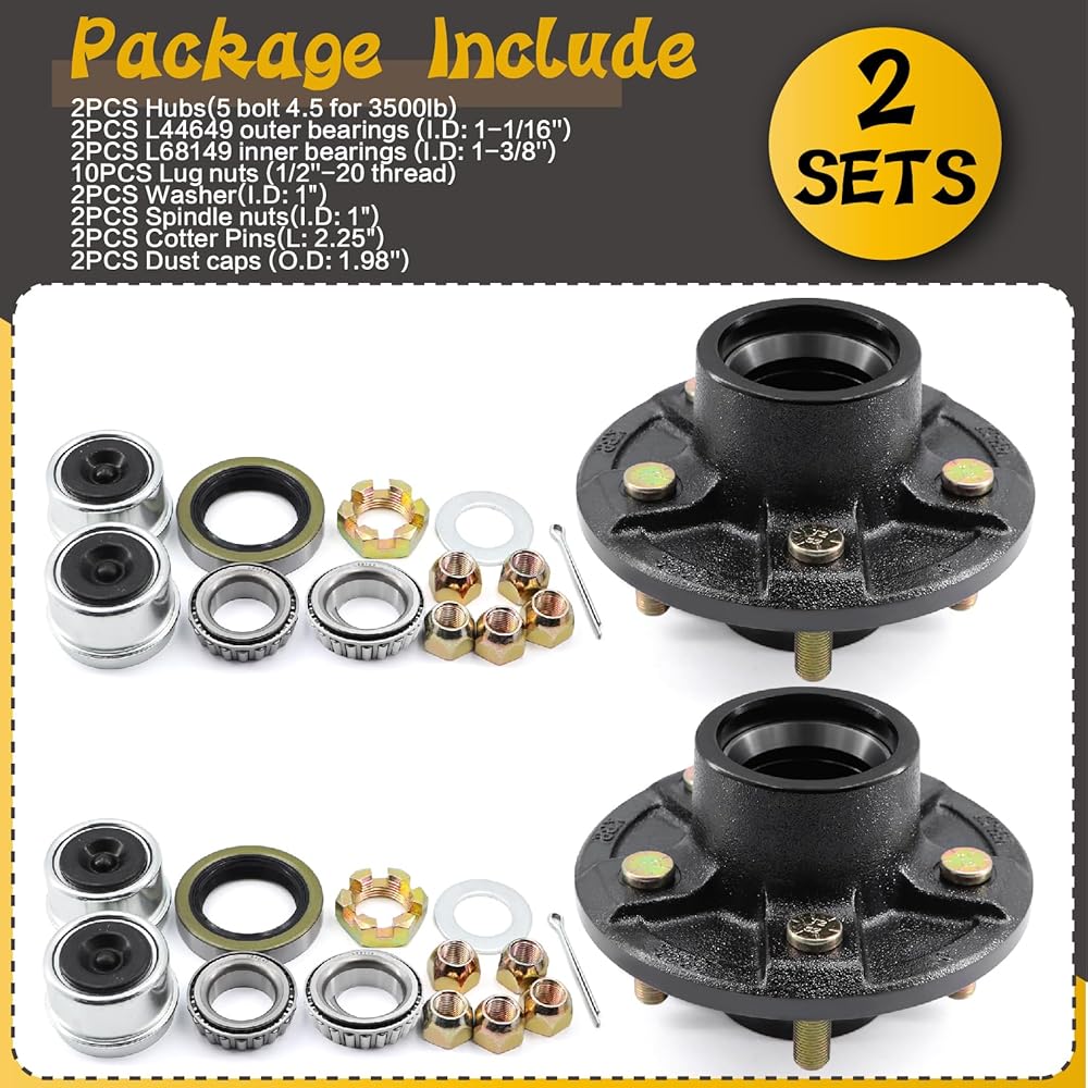 - Kit including:2PCS Hubs(5 bolt 4.5 for 3500lb),2PCS L68149 inner bearings (I.D: 1-3/8''),2PCS L44649 outer bearings (I.D: 1-1/16''),10PCS Lug nuts (1/2''-20 thread),2PCS Washer(I.D: 1"),2PCS Spindle nuts(I.D: 1"),2PCS Cotter Pins(L: 2.25"),4PCS Dust caps (O.D: 1.98''),4PCS Rubber Plugs(2.56" O.D - 1.72" I.D).