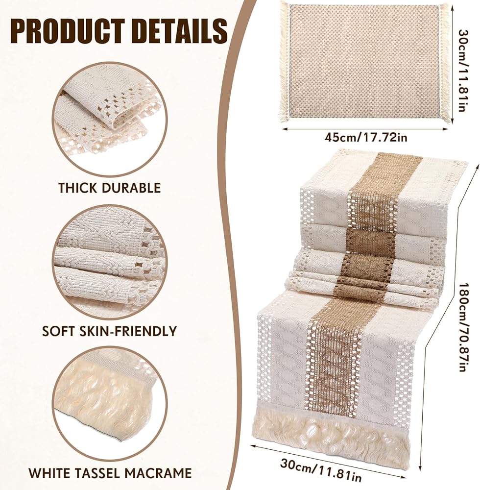 مجموعة مفرش طاولة ومفارش بوهو ماكرامي مكونة من 6 قطع، مفرش طاولة مزرعة بوهو مع مفارش مكان لطاولة الطعام مفارش طاولة من الخيش الطبيعي مع شرابات لطاولة القهوة (بيج وبني)