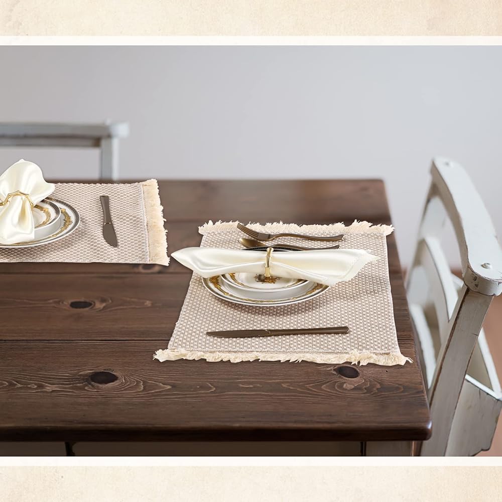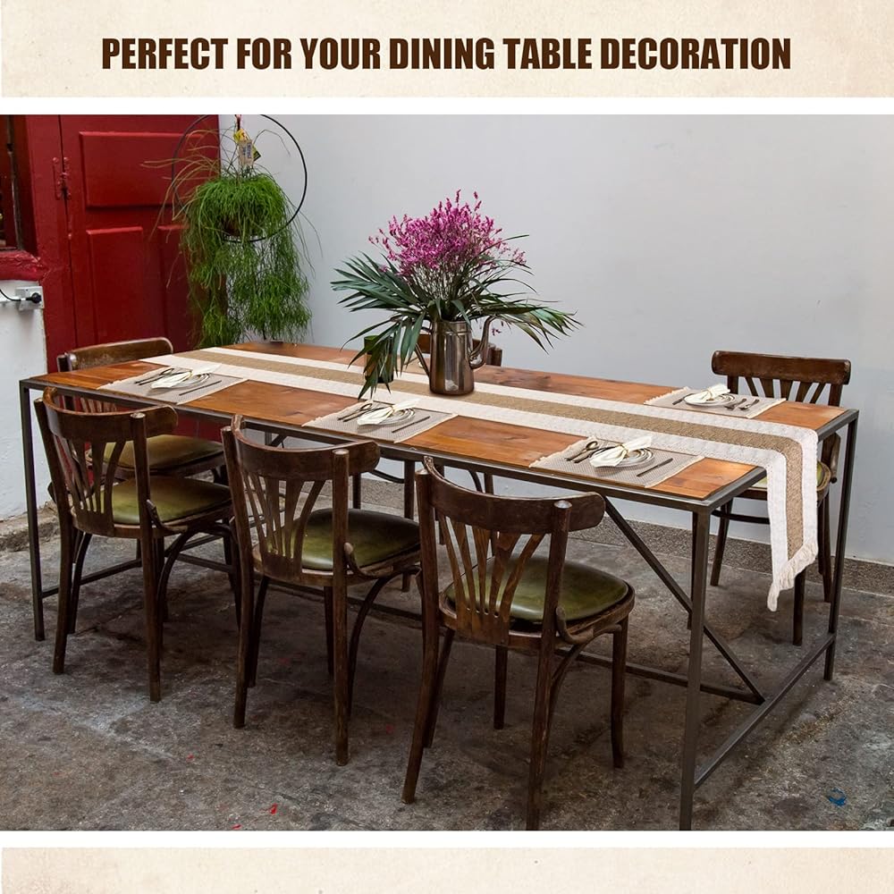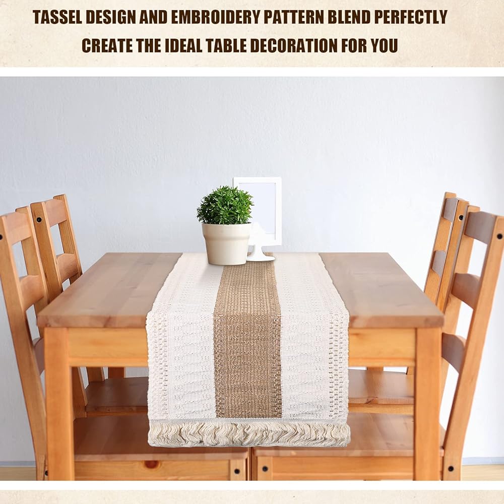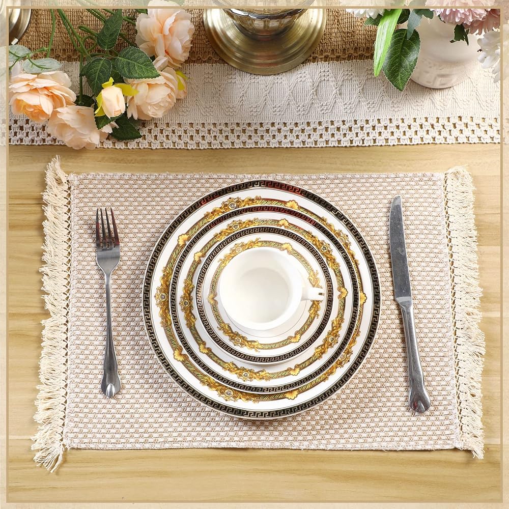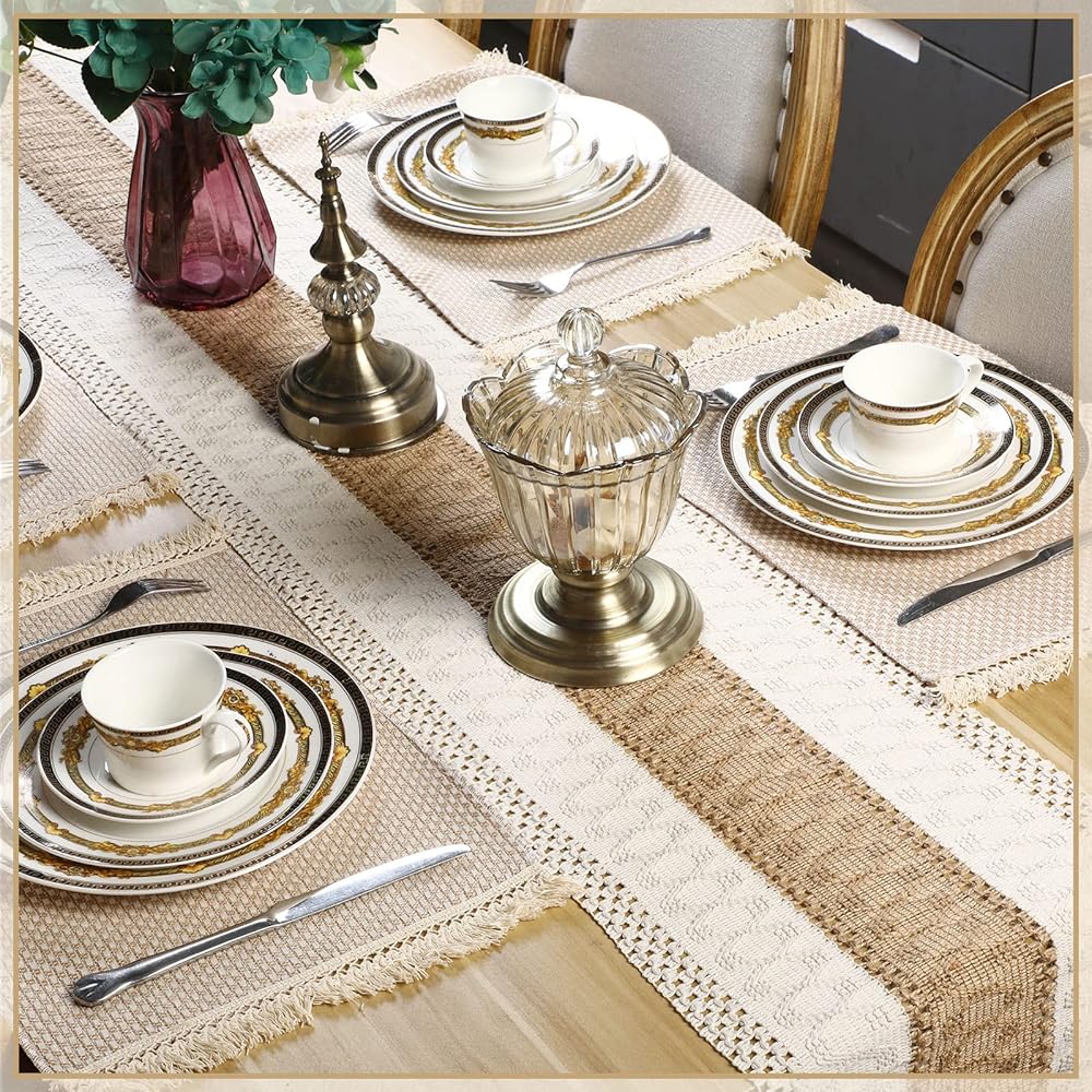 تصميم على الطراز البوهيمي: مجموعة مفرش الطاولة ومفارش الأطباق مصنوعة من نسيج قطني مخطط مجوف منسوج من الخيش الرقيق، تصميم أنيق مصنوع يدويًا وشرابة ونمط تطريز بسيط ممزوج بشكل مثالي معًا مما يساعدك على إنشاء إعداد مثالي للطاولة