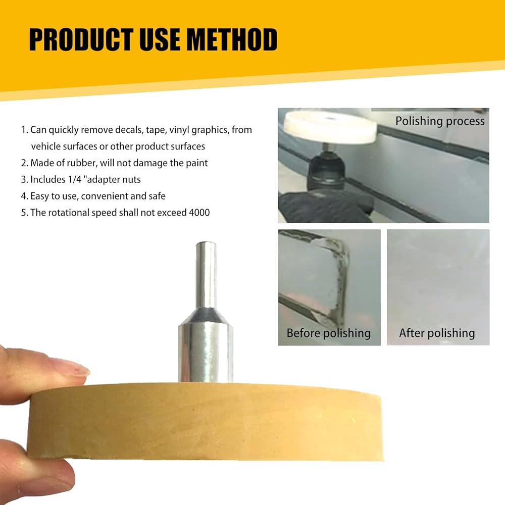 Multifunctional Application: The rubber wheel can be used to clean various adhesive and tape residues on the car surface, such as car stickers, logos, tapes, on the car body. It is also suitable for adhesive cleaning and surface preparation tasks in other industrial areas.