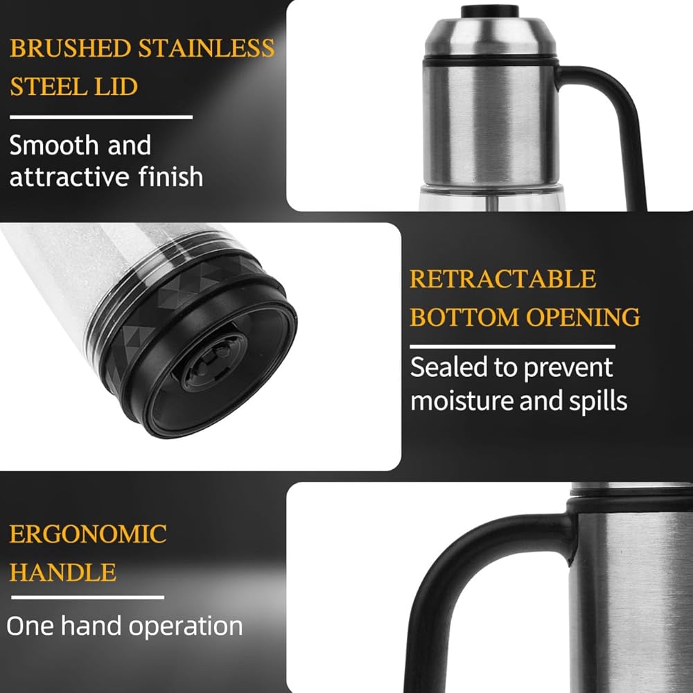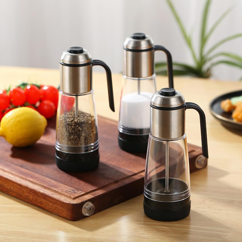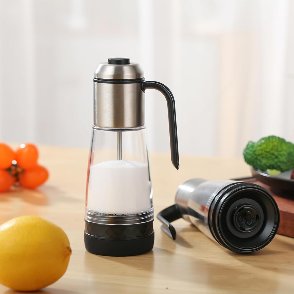 SIMPLIFIED CLICK-AND-GO SYSTEM: Our meticulously designed system eliminates the need to invert the salt bottle for sprinkling. Simply pick up the salt bottle, press the button, and let the transmission rod open the salt output hole, ensuring even salt distribution on your food.