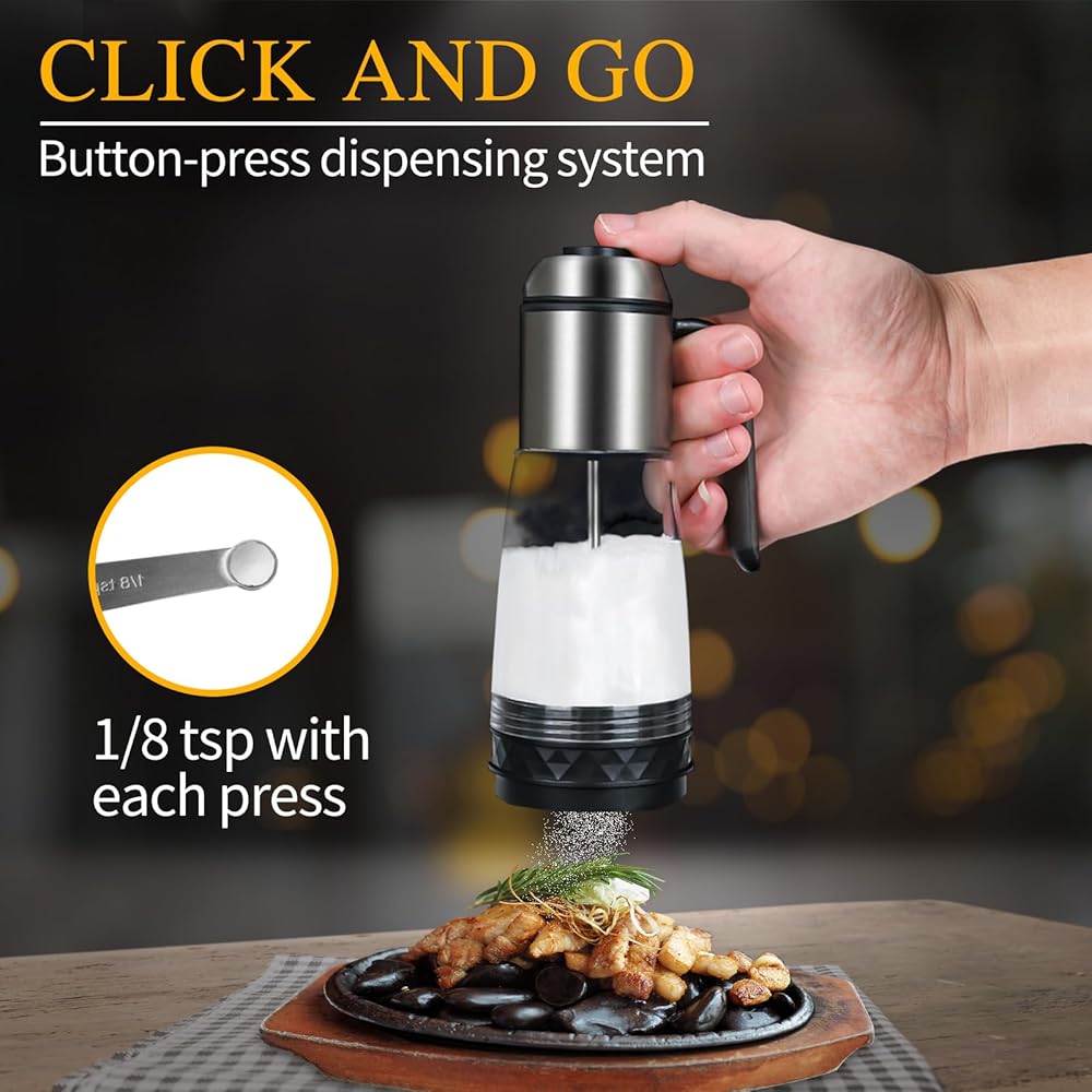 PRECISION PORTION CONTROL: Press the top button to dispense 1/8 tsp (0.5g) with each press. Continue pressing the button as needed to achieve your desired quantity without the need for measuring spoons. Take full control of your spice quantities to suit your taste preferences.