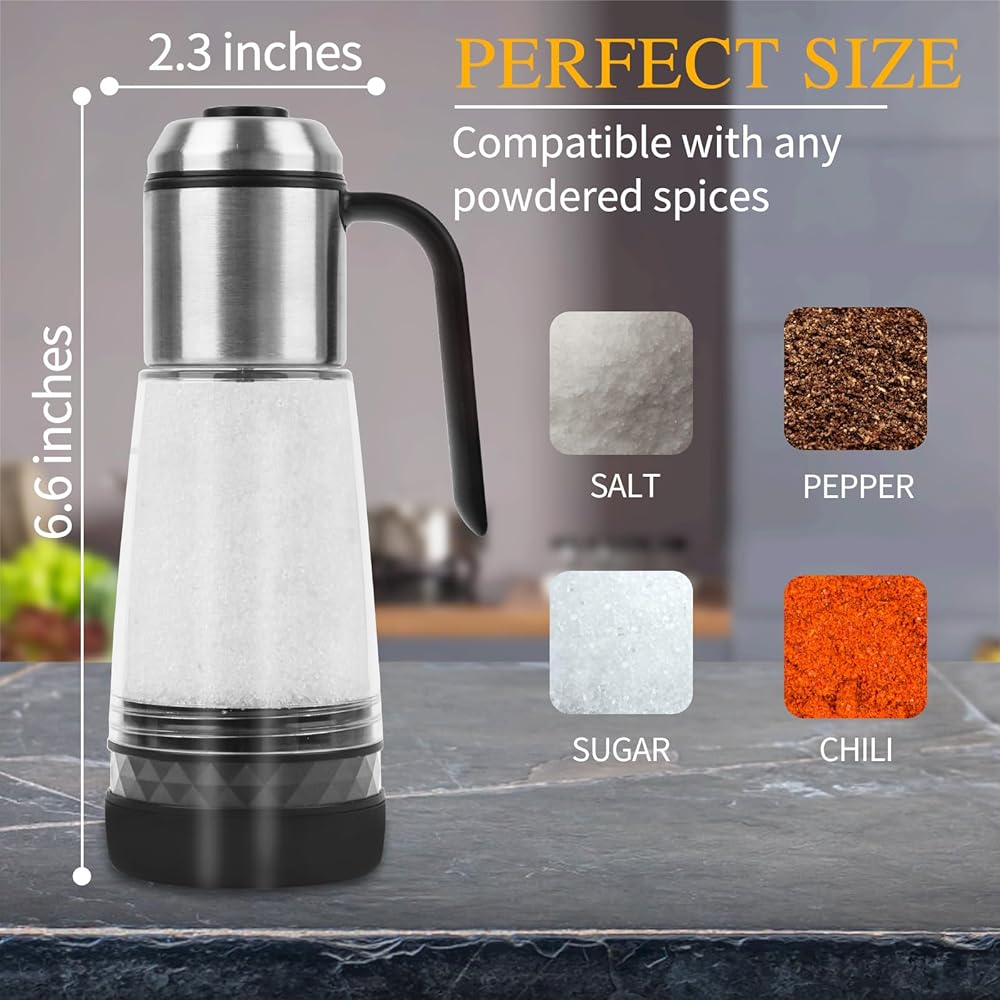 ENSURED SAFETY&EASY TO USE : Our salt shakers are certified to meet strict food-grade standards, ensuring both safety and reliability in your kitchen. Prioritize your well-being while enhancing your culinary creations. With a comfortable angled handle and one-handed operation.