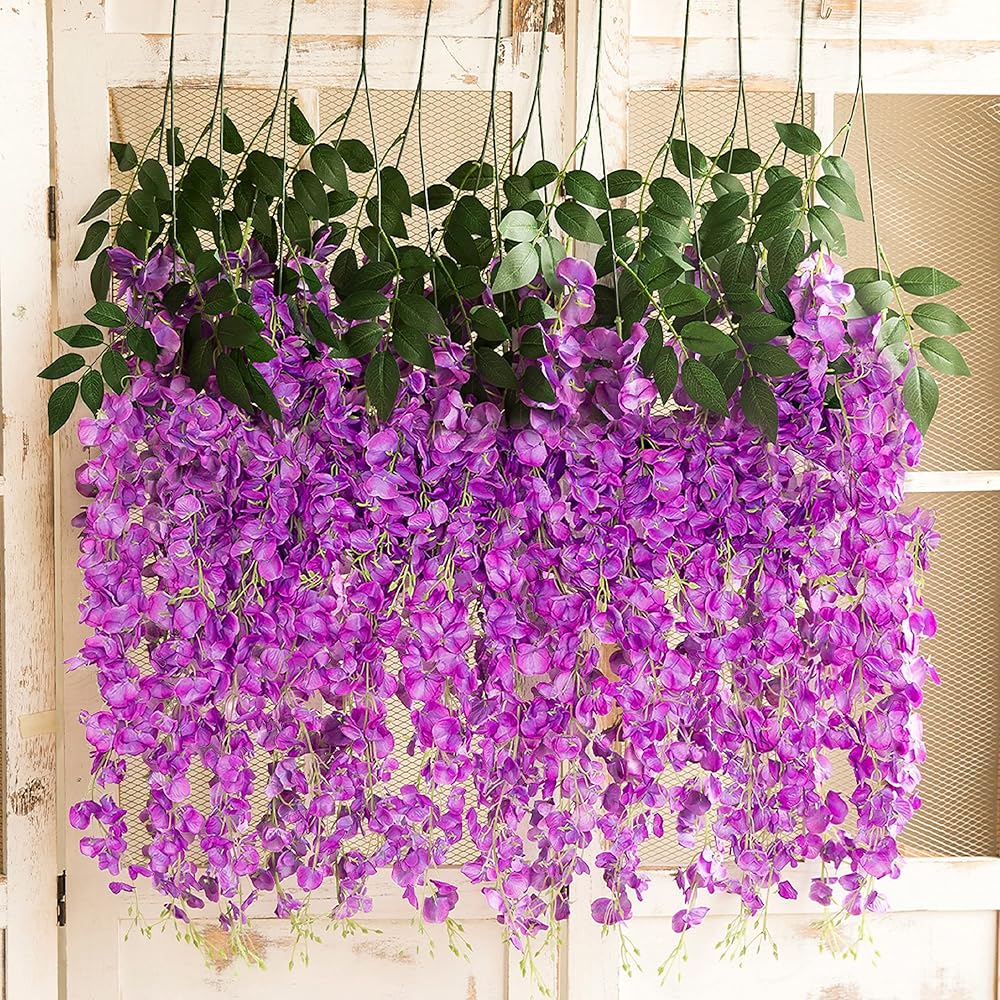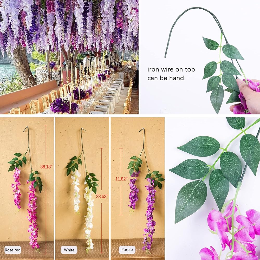 حجم زهور الكرمة الصناعية: يبلغ طول زهرة الوستارية المعلقة هذه 3.2 قدم/خصلة، كل خصلة تحتوي على سيقان زهرة، 1 خيط أطول 23.6 بوصة، 1 خيط أقصر 11.8 بوصة. 1 طلب يتضمن 6 جدائل من الوستارية.