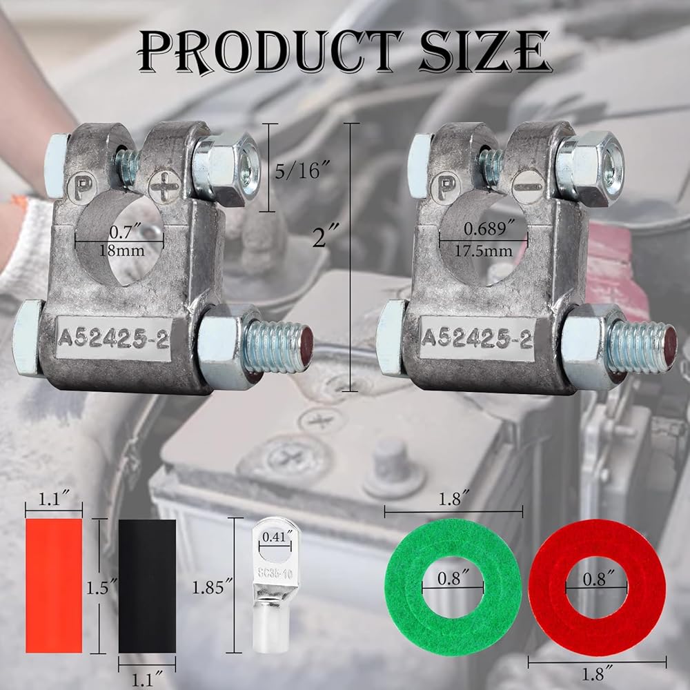 🛻[مجموعة موصلات طرفية البطارية] قطعتان من أطراف البطارية شديدة التحمل، وقطعتان من غسالات مقاومة للتآكل، و4 قطع أنابيب قابلة للانكماش بالحرارة، و4 قطع من العروات النحاسية المثبتة بمسامير مقاس 3/8 بوصة.