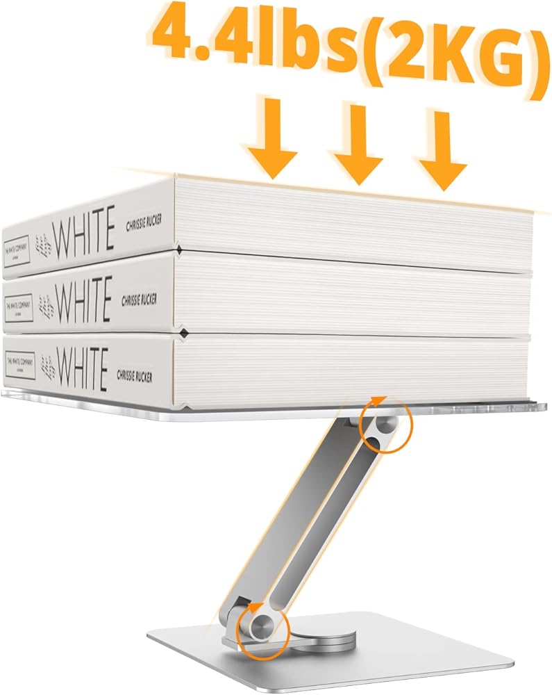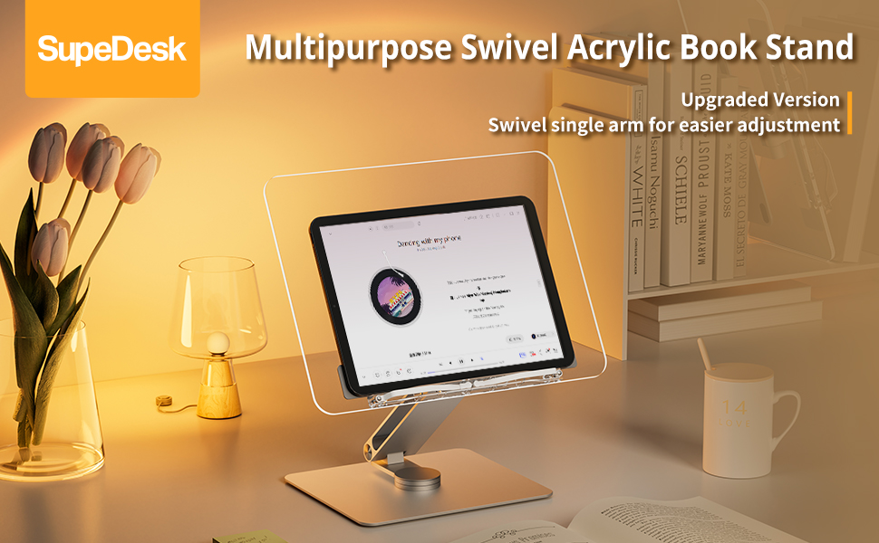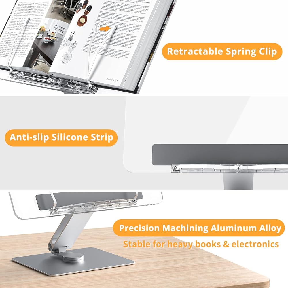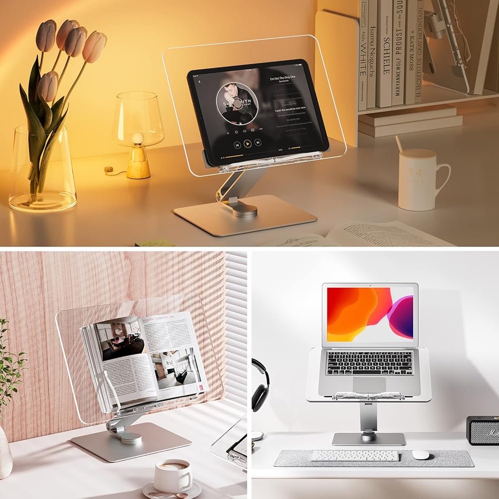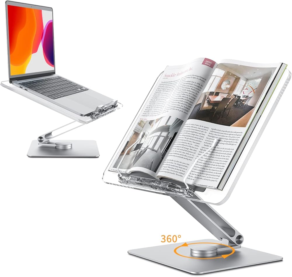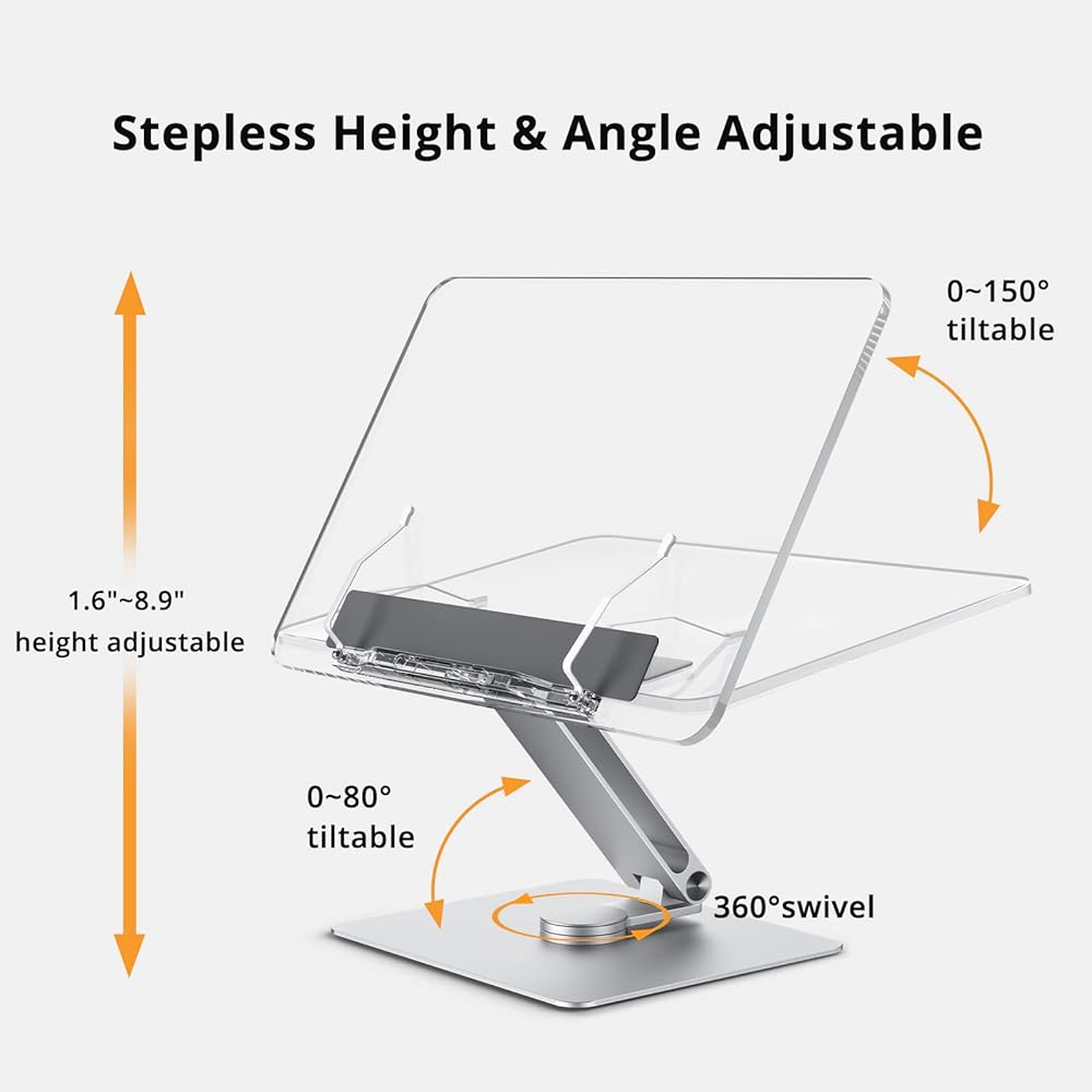 حامل كتب أكريليك، دوار، لوحة شفافة، يدور 360 درجة، زاوية ارتفاع قابلة للتعديل، قابل للطي، حامل كتب للقراءة، حامل الكمبيوتر المحمول، WFH، الدراسة، حامل الكتابة، الحد الأدنى