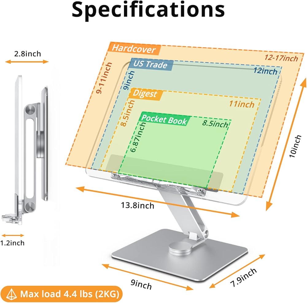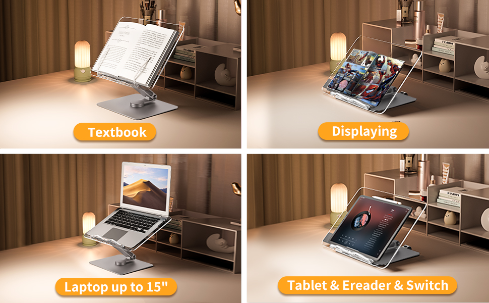 【ذراع ثابت وقاعدة دوارة】 القاعدة بأكملها مصنوعة من سبائك الألومنيوم، وتضمن الآلات الدقيقة ثباتها. أحدث هيكل الدوران السفلي يحقق الدوران الصامت. قم بضبط الكتاب المرجعي والكتاب المدرسي بسهولة وفقًا لوضعك للدراسة أو الكتابة. أيضًا، عند استخدامه كحامل كمبيوتر محمول أو حامل كمبيوتر لوحي، فإنه يساعد على مشاركة الشاشة مع شركائك، مما يجعله مثاليًا لعرض وشرح المستندات في المكتب، والاجتماعات والعروض التقديمية، وWFH، والتعليم عبر الإنترنت، وما إلى ذلك.
