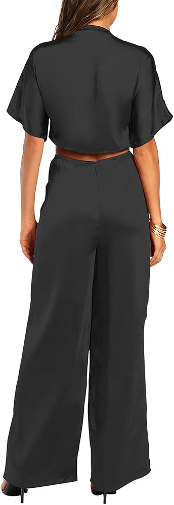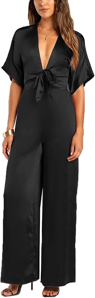 المزايا: نمط فضفاض، كم قصير، مقاس نحيف، رقبة عميقة على شكل حرف V، ربطة عنق أمامية ذاتية، أربطة، سراويل طويلة واسعة، لون سادة من الساتان، خصر مرتفع، أساسي، بدلة قفز أنيقة