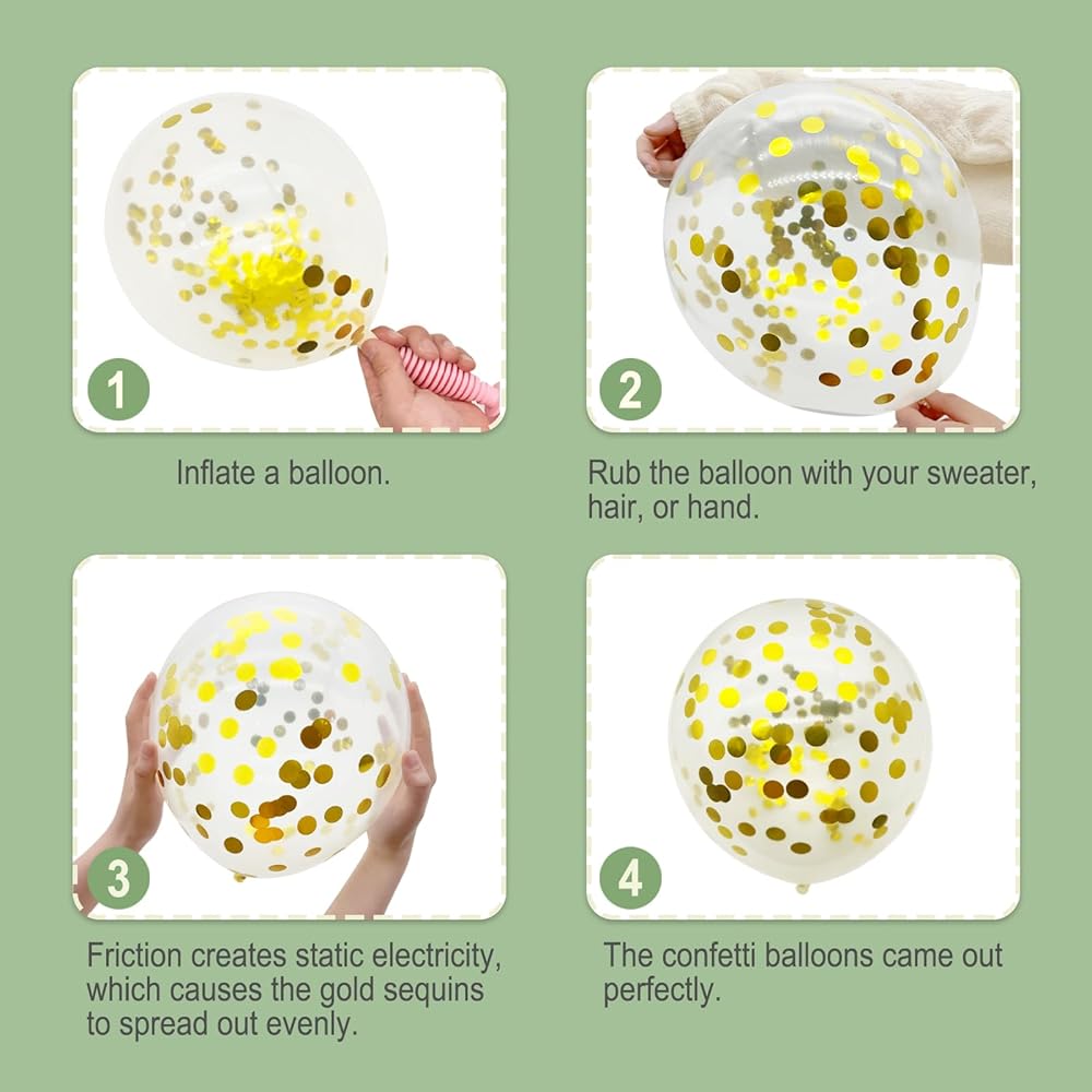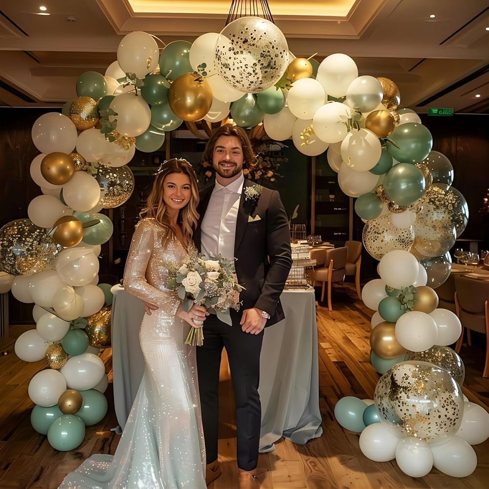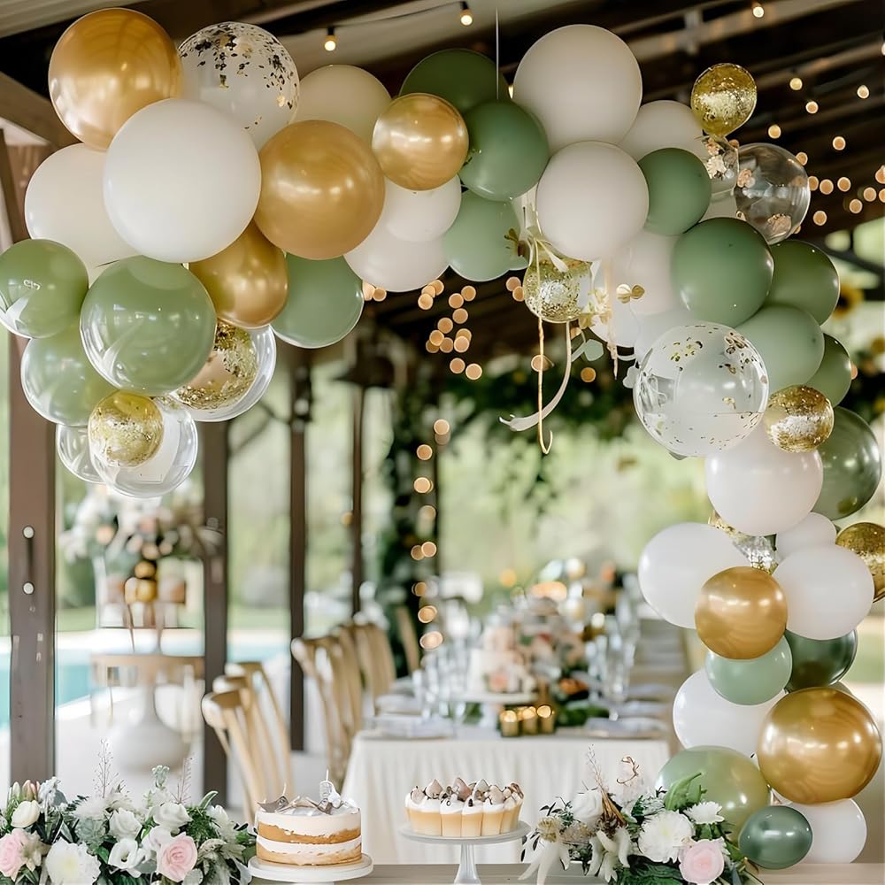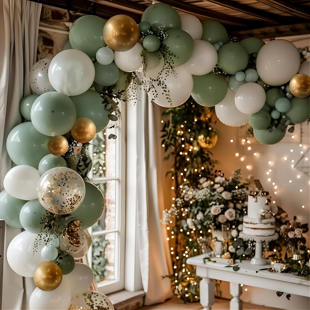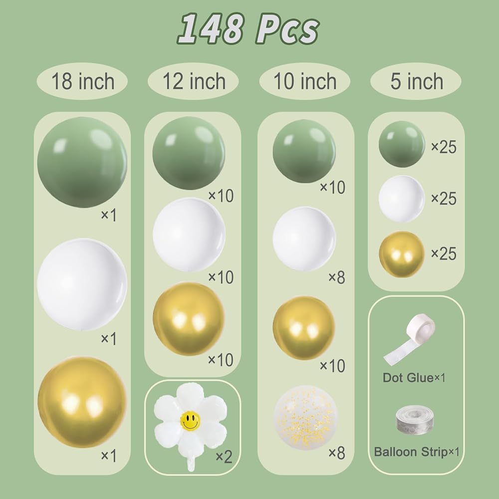 مجموعة قوس البالون الأخضر المريمية: تحتوي مجموعة قوس البالون الأخضر المريمية هذه على 148 قطعة، تحتوي على بالونات لاتكس بأحجام مختلفة، وبالونات قصاصات ذهبية، وبالوناتين مبتسمتين على شكل زهرة الأقحوان مقاس 12 بوصة، وتشتمل العبوة أيضًا على لفة من سلسلة البالونات بطول 16.5 قدم ولفة 100 نقطة من الغراء نقطة البالون. من خلال المزيج المجاني من ملحقات تزيين البالونات هذه والبالونات الخضراء المريمية، يمكنك إنشاء أقواس بالونات رائعة وجميلة.