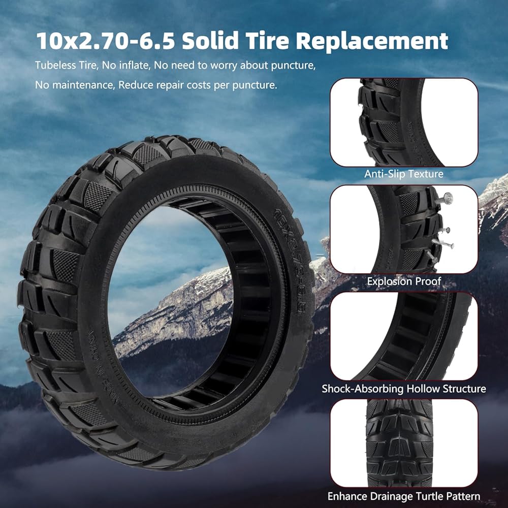 【Solid Tires Features】10 inch scooter tire, tubeless tire, no swelling, no inflate, no need to worry about puncture, no maintenance, always in the best condition. Tires can withstand any pressure change, just as regular tires are as strong when fully inflated. Reduce repair costs per puncture.