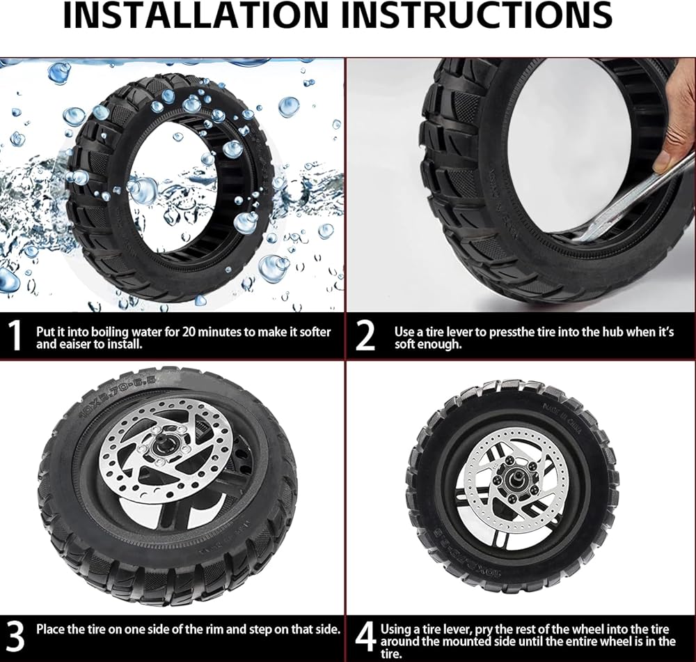 【Note】Product contains: 1 x Solid Tires, 1 x Tire Levers. Soften the tire by soaking it in boiling water for 15 minutes before installation, and then install it on the hub.