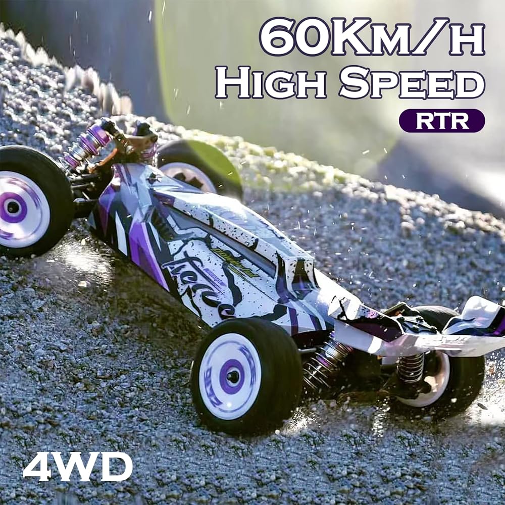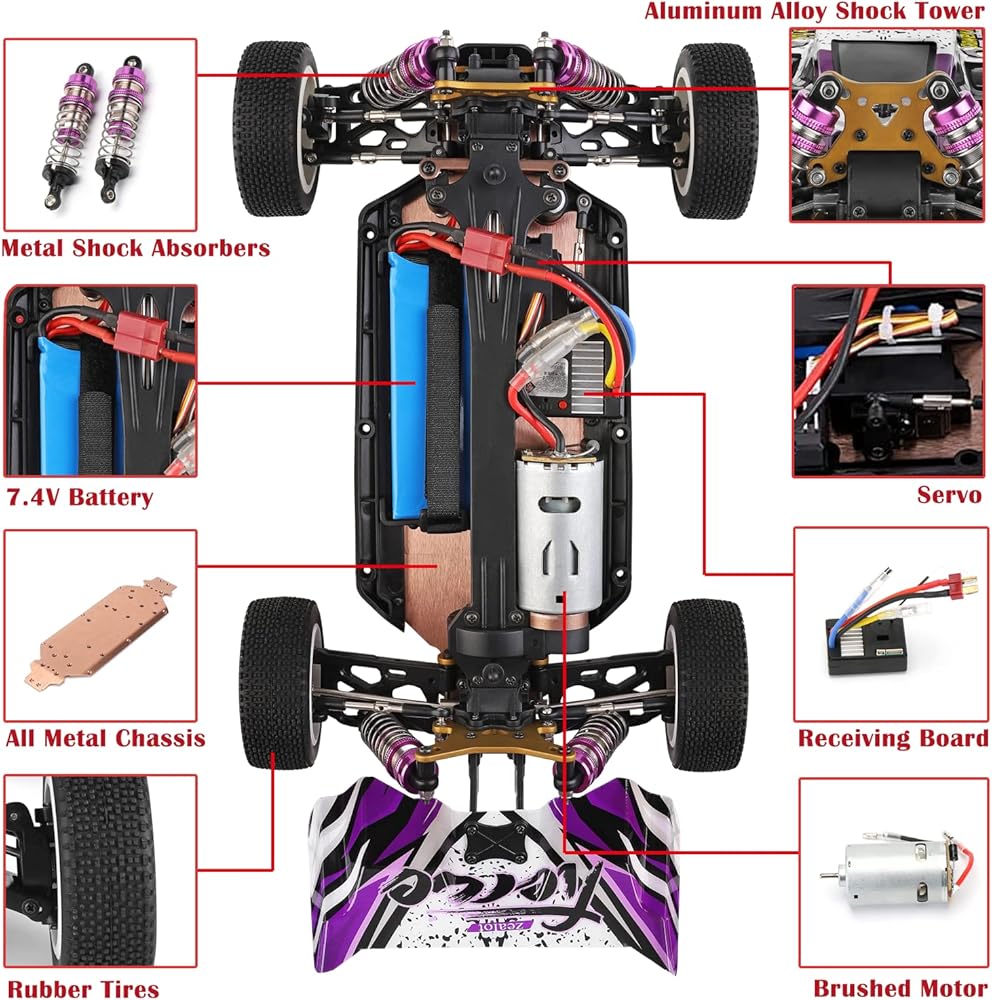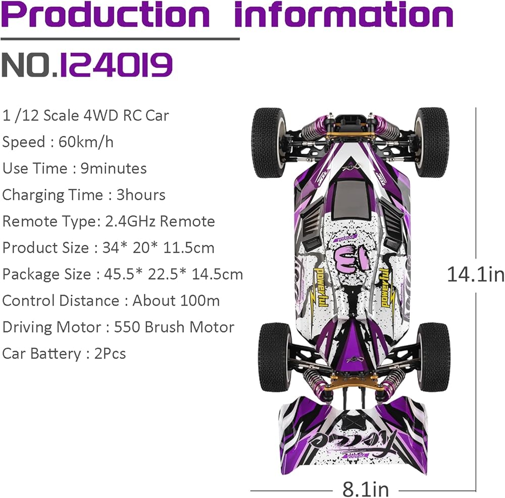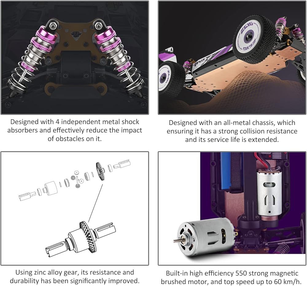 CKYSCHN WLtoys 124019 RC buggy cars built-in 7.4V 17500RP 550 brushed motor, the top speed up to 60kmh/37mph. The fast RC car supported by 4 independent oil-filled suspensions, making it capable of adapting to most terrains.