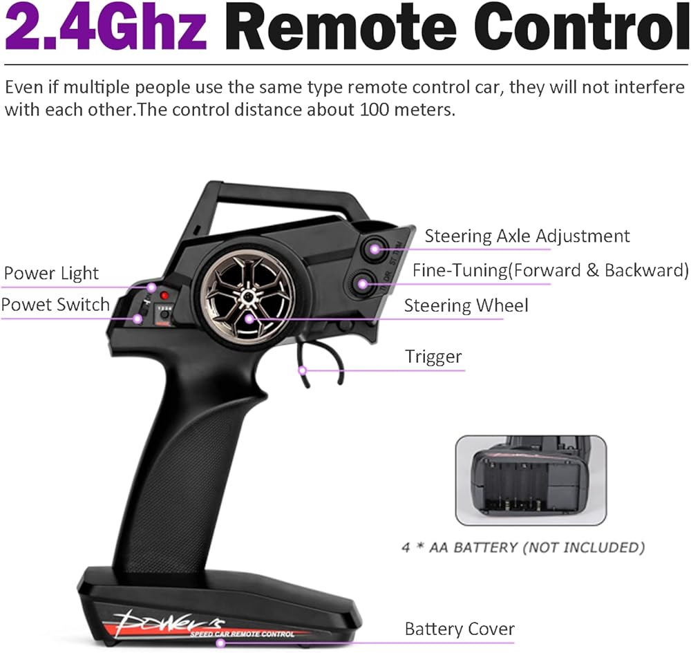 WLtoys 2.4Ghz Controller has anti-interference ability. Even there are other people in the operation of car nearby, it will not be interfered with the same frequency. The control distance is about 100 meters/328ft.