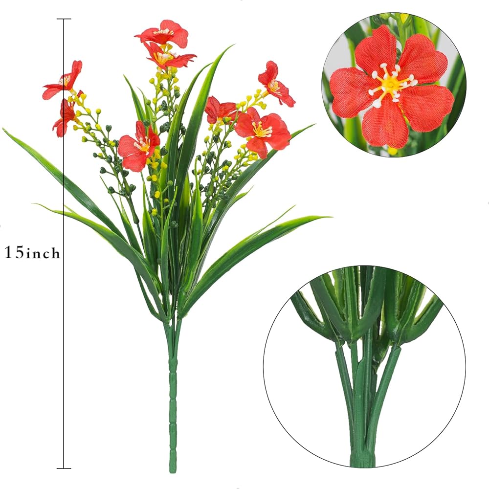 All-Weather Beauty: Elevate your outdoor space with our set of 8 bundles of artificial outdoor flowers. Crafted from high-quality silk material and UV-resistant plastic berries, these flowers will maintain their vibrant blooms year-round, rain or shine.