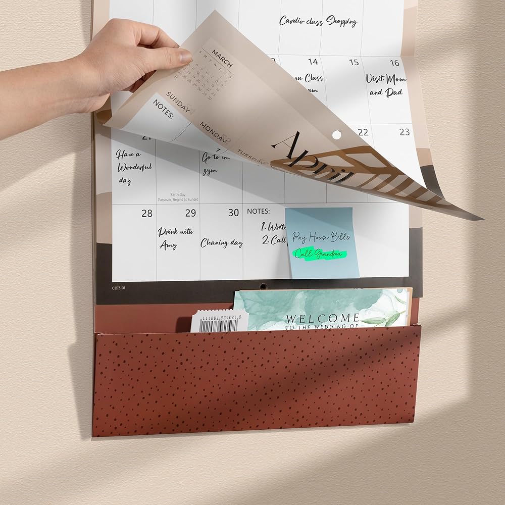تقويم حائط مع جيب: يتميز هذا التقويم البوهيمي بجيب واسع يناسب العناصر المهمة. يمكنك تخزين بطاقات أعياد الميلاد الخاصة، والكوبونات، وتذاكر الحفلات الموسيقية، وبطاقات المواعيد، والفواتير، وما إلى ذلك.