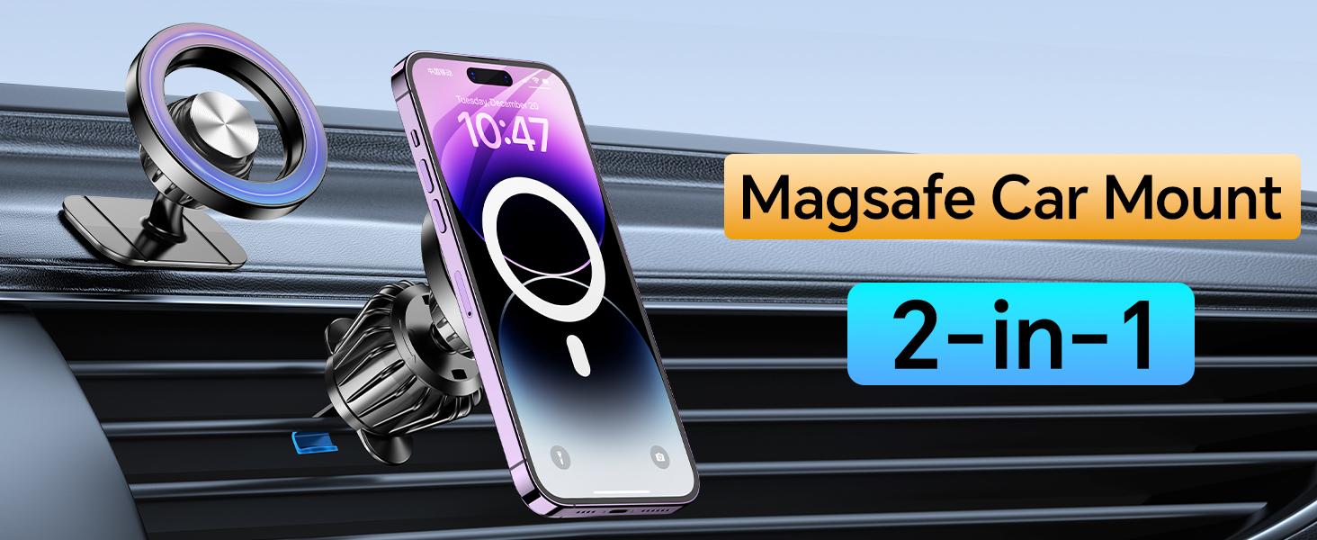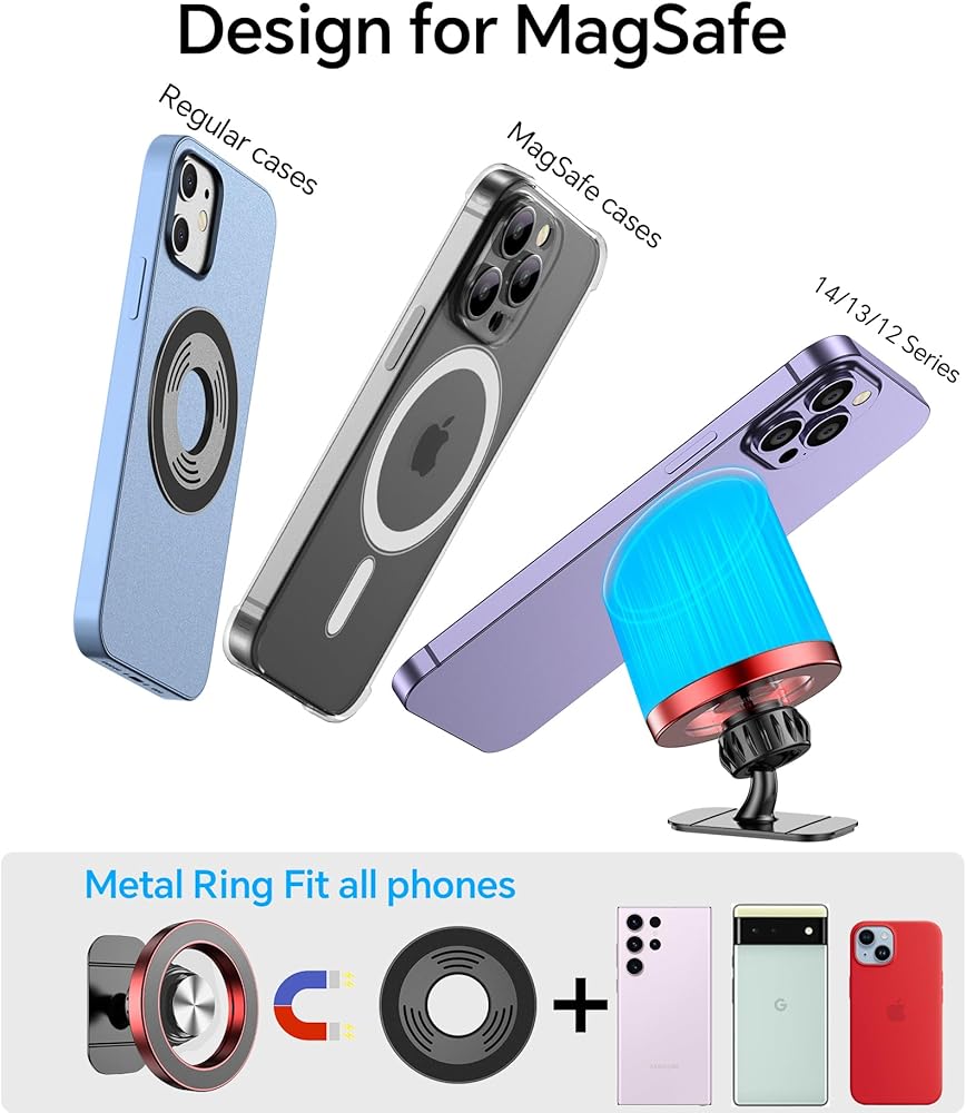 ✅【مصمم لـ Magsafe】 - تم تصميم حامل سيارة iPhone الأكثر أناقة في عام 2023 Magsafe لهاتف iPhone 12/13/14 Pro Max Mini وحافظات Magsafe الرسمية وحافظات الهاتف المغناطيسية الأخرى ويمكن تثبيته مباشرة على هذه الهواتف دون الحاجة إلى التثبيت لوحات معدنية. جميع هواتف أندرويد ستعمل: يتم توفير حلقتين معدنيتين إضافيتين؛ أنها تناسب الحالات والهواتف الأخرى دون magsafe