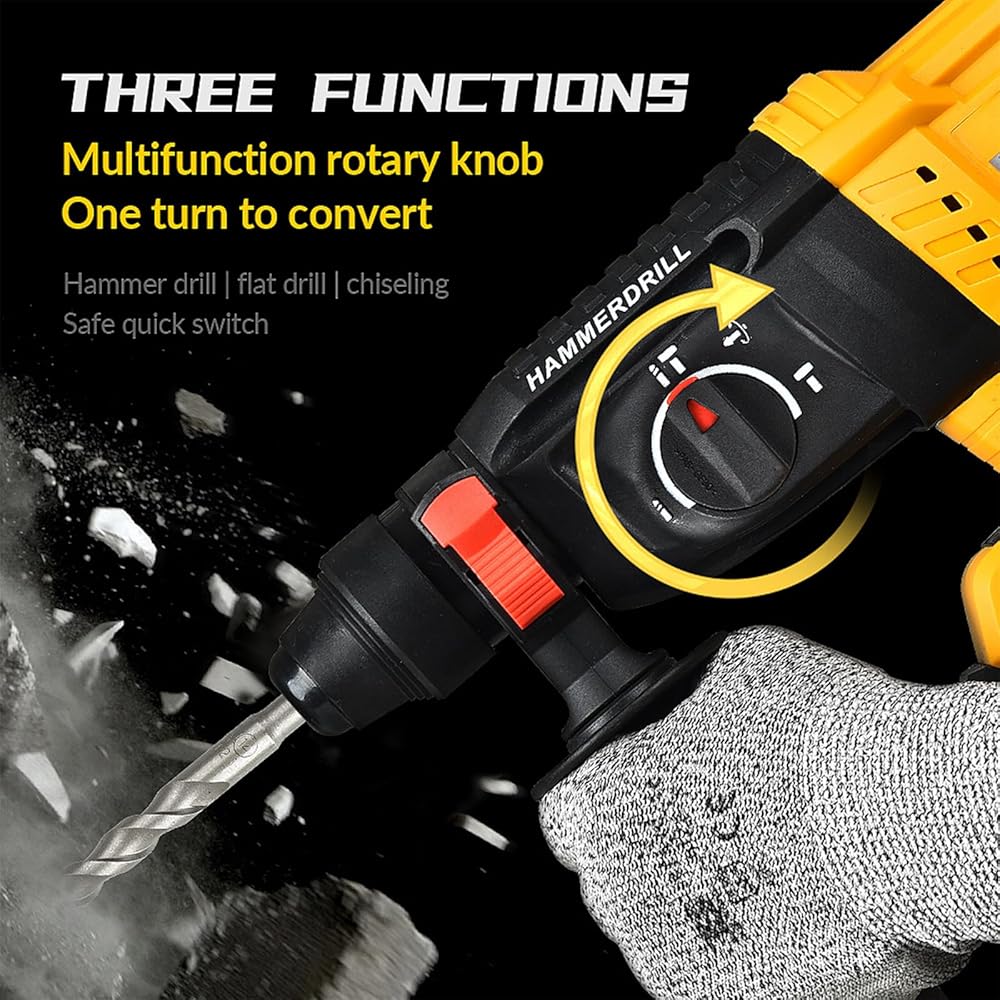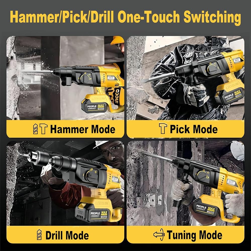 【Safety & Quickly Change】 The hammer drill features a built-in overload clutch protector and automatic thermal shutdown. The overload clutch protection system protects your wrist and extends the life of the motor when the drill bit gets stuck. And you can quickly switch between the 4 modes of “Hammer Drill”, “Drill”, “Chisel” and “Chisel Angle Adjustment” with the knob to meet a variety of needs.