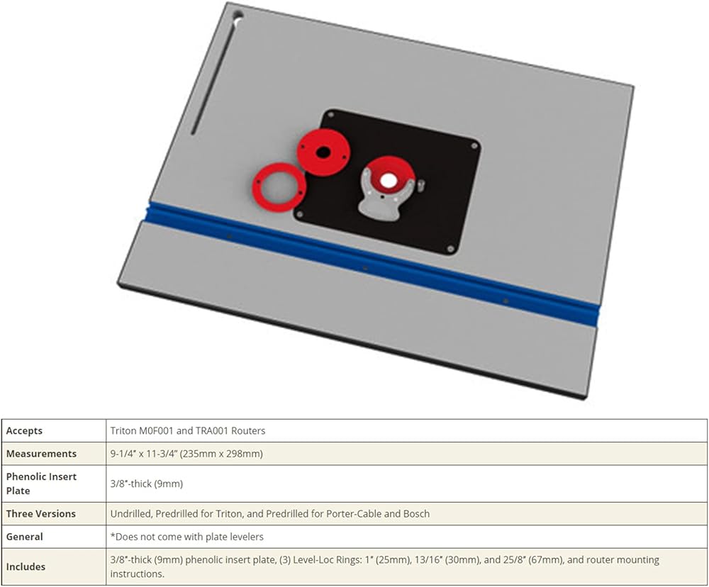 We provide life-long warranty service for the goods you buy in Ruian-store. We adhere to the principle of ""customer is God"" and wholeheartedly provide the best quality service for the buyer. We pay special attention to the satisfaction of the buyer. As long as you need to contact us at any time, we will answer all your questions at the first time! SPECIFICATIONS: INCLUDES THE FOLLOWING PIECES: (1)Precision Router Table Insert Plate Kit Direct installation Built to strict quality control standards characteristics: 1.Easily align and center this plate on almost any router. 2.Solid, Flat, and Perfectly Level Mounting Surface. COMPATIBLE MODEL compatible with almost any router This plate comes with predrilled holes and mounting hardware compatible with Porter-Cable 690 and 890 Series, along with the Bosch 1617 SIZE 9 1/4 inch by 11 3/4 inch POINTS TO NOTE 1. Before you buy, please check the model as much as possible to ensure that the product you buy is what you need! 2. Professional installation is highly recommended! 3.This Precision Router Table Insert Plate Kit Assembly of ours has a lifetime warranty service, you can leave a message if you encounter any problems, we will be the first time to reply to you!