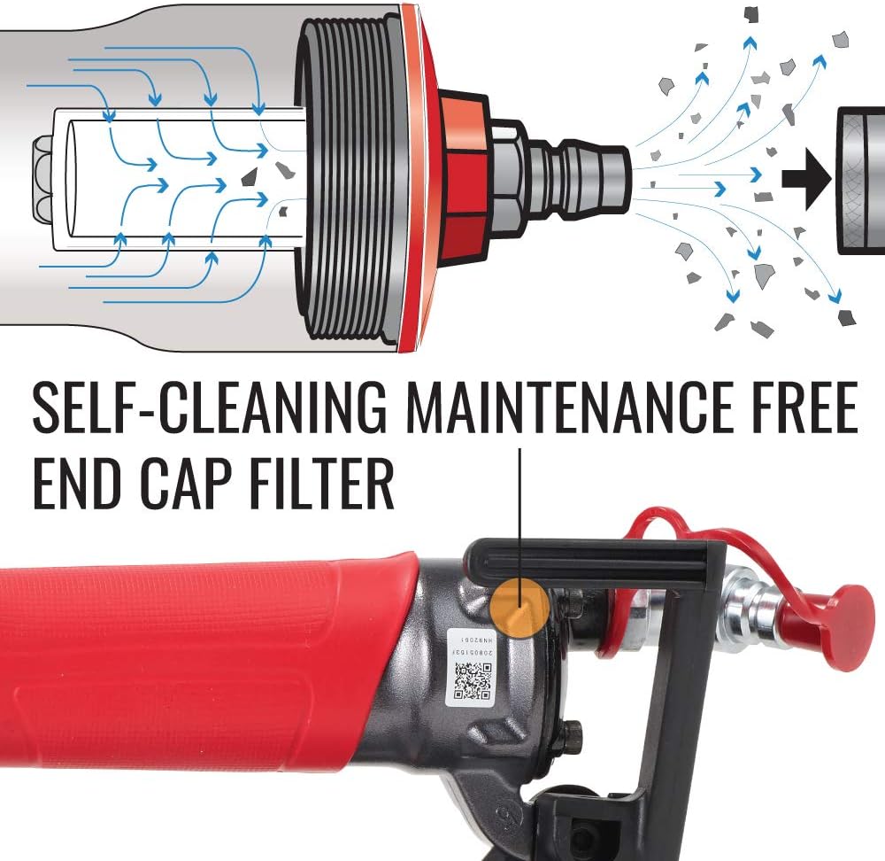 SELF-CLEANING FILTER FOR RELIABLE OPERATIONS: Patented maintenance free end cap filter prevents foreign substances from entering the tool, allowing users the reliability to carryout work efficiently. Designed with a self-cleaning feature; the filter automatically ejects foreign substances and debris from the tool when the air hose is disconnected each and every time.