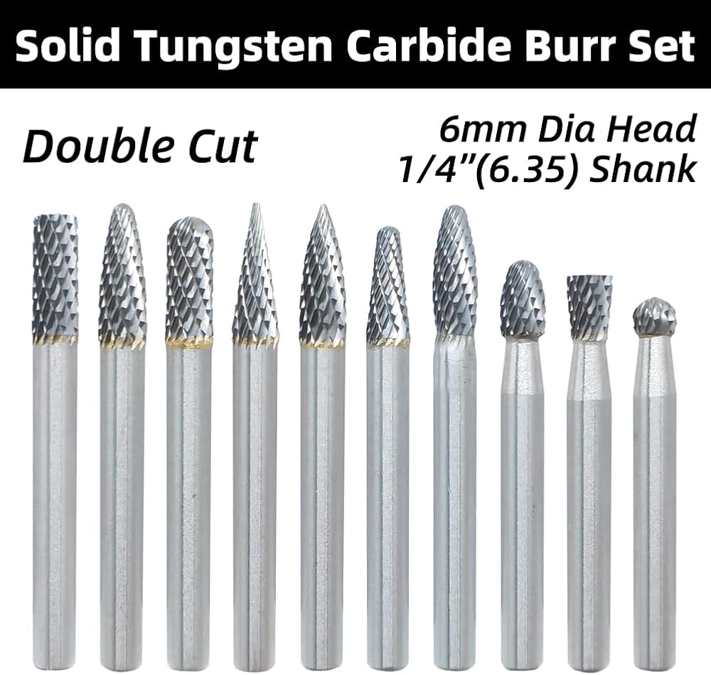 10pcs Carbide Burr Set 1/4 Inch Shank, Head Dia 6mm Die Grinder Bits, Double Cut Solid Tungsten Rotary Files for Steel and Wood Working, Grinding, Carving, and Engraving