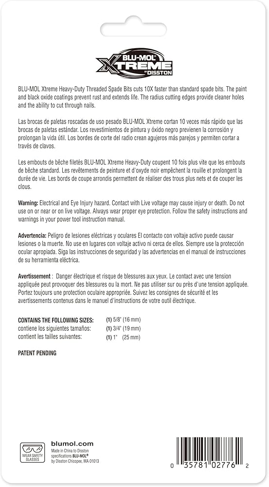 Disston BLU MOL XTRM Heavy Duty 6" Spade Bit, 3 pc set. Dia. Cuts 10X FASTER then standard Spade Bits -Cuts through Nails in Wood. (5/8", 3/4", 1") 6" Length