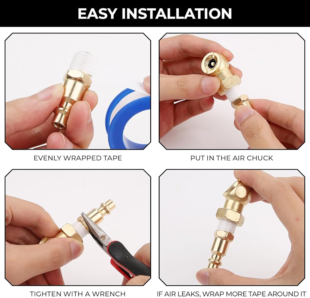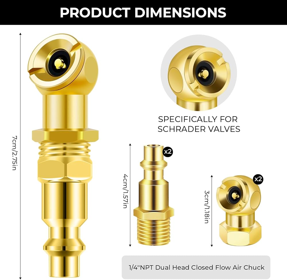 High Quality Air Chuck Set: Our 2 pack air chucks are crafted from solid metal for superior durability. These automotive safety accessories are designed to fit 1/4" NPT air sources for efficient and leak free tire inflation, the set includes a thread seal tape.