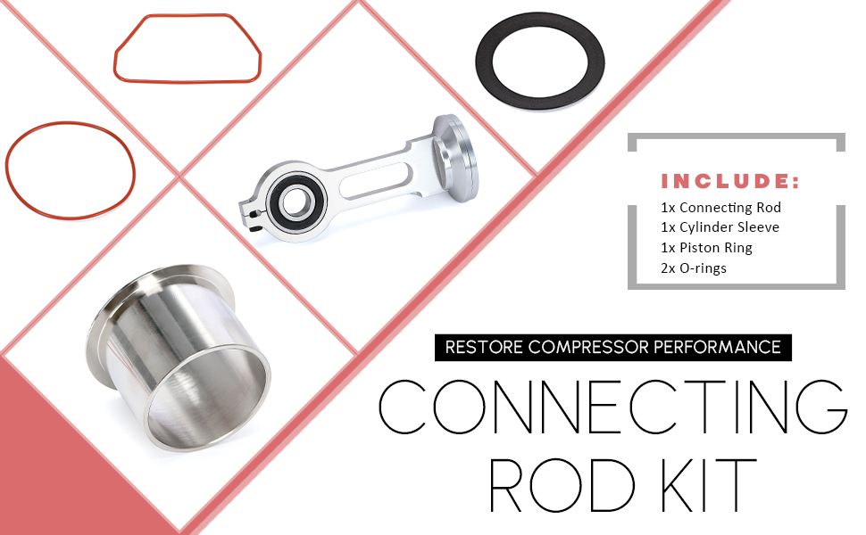 - تشتمل مجموعة استبدال قضيب توصيل مكبس الضاغط PQY على: 1 × قضيب توصيل، 1 × حلقة مكبس، 1 × غلاف أسطواني و2 × حلقة دائرية.