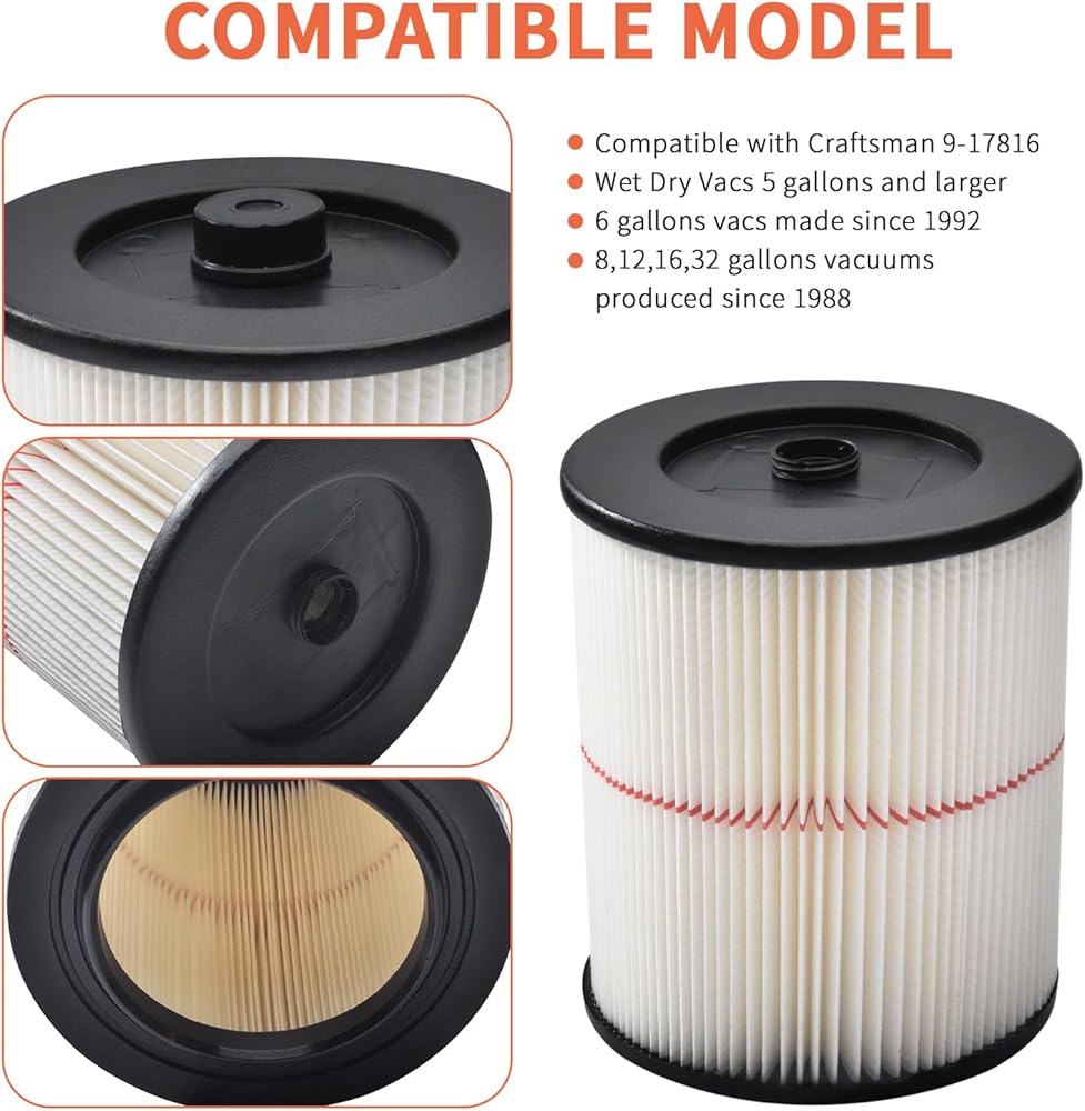 5 نماذج متوافقة - فلتر استبدال خرطوشة مكنسة كهربائية 9-17816 ذو شريط أحمر عالي الجودة، فلتر خرطوشة رطب/جاف متوافق مع مكنسة كهربائية Craftsman 17816 9-17816، تناسب معظم البطاريات سعة 5 جالون والأماكن الأكبر حجمًا. (البحث عن النموذج المحدد الخاص بك في الوصف).