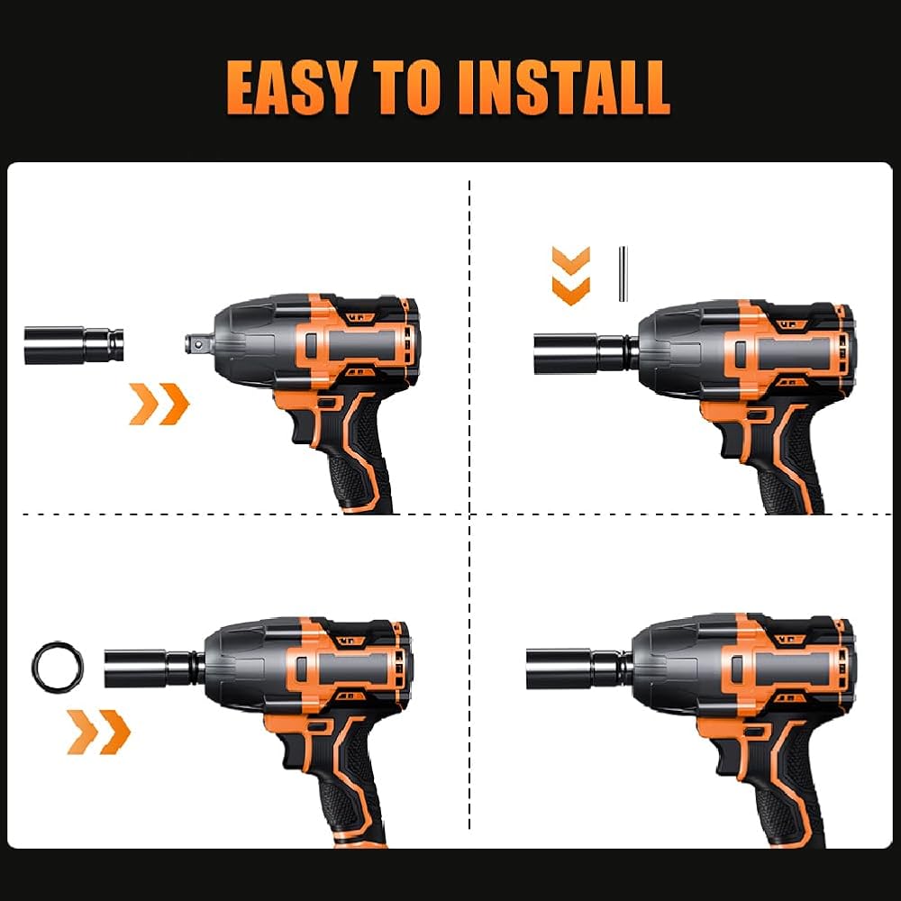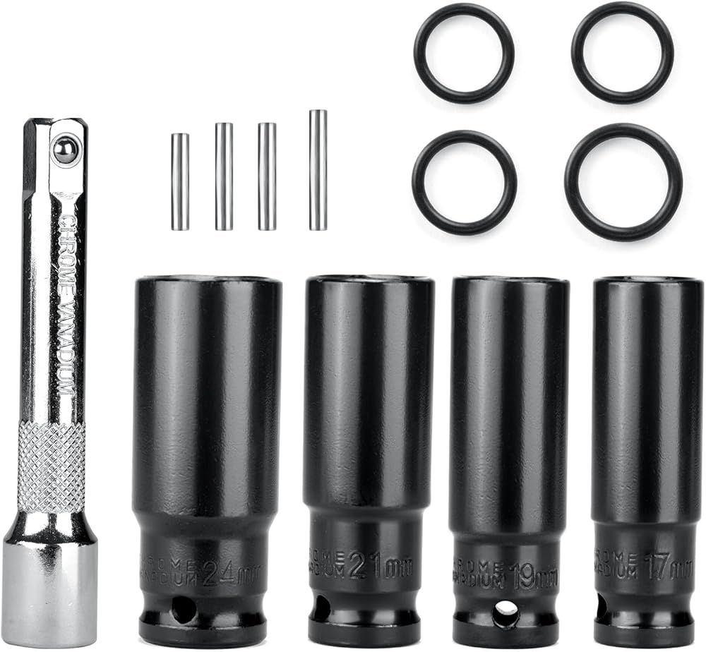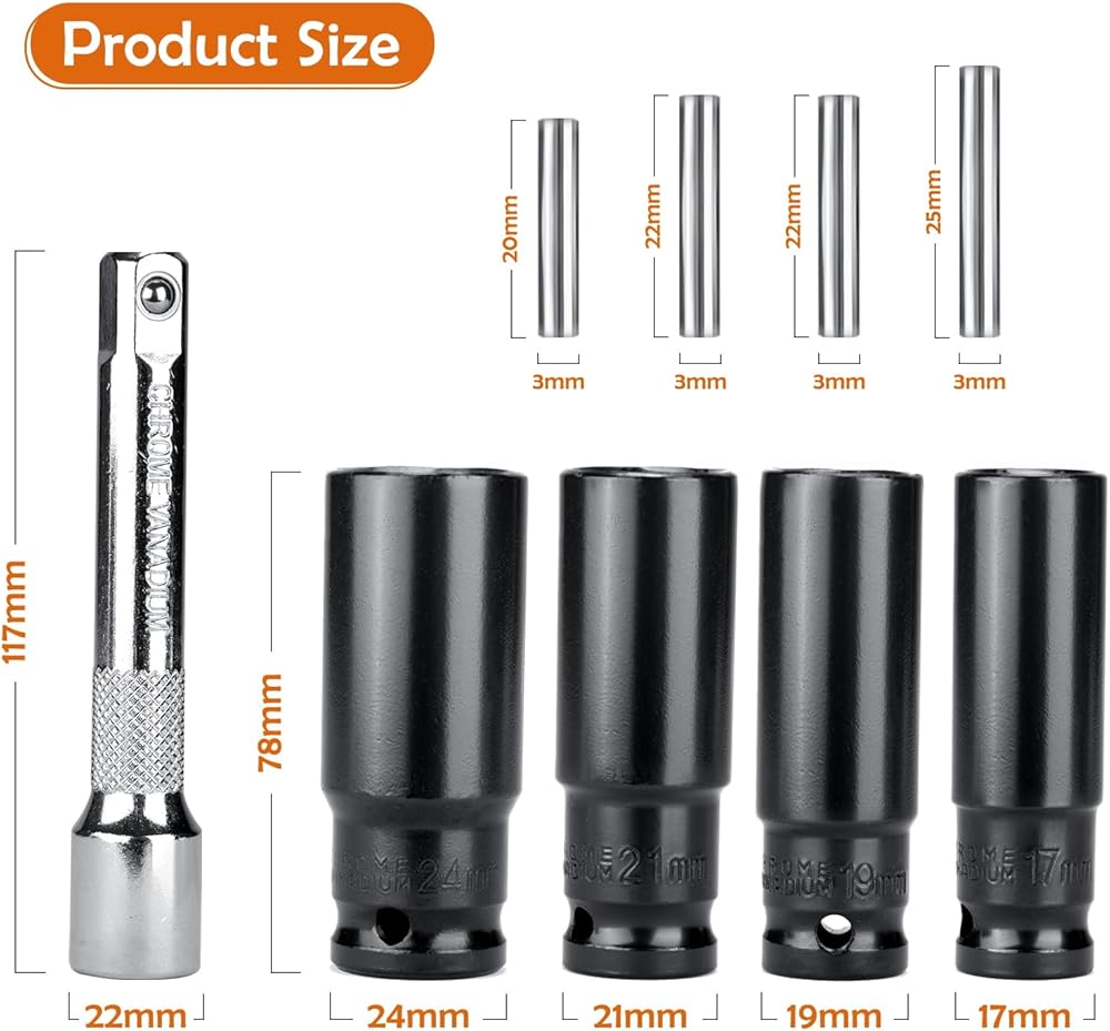 Durable Steel---Multi-Size Sockets: 1/2" Drive sockets made of high-quality high-carbon steel, reliable and sturdy, suitable for long-term use; more worry-free and convenient. 4PCS socket sizes: 17mm, 19mm, 21mm, 24mm; 10PCS SAE: 67/100, 3/4, 83/100, 47/5. Suitable for most 1/2-inch impact drivers, it can meet your usage needs in most cases.