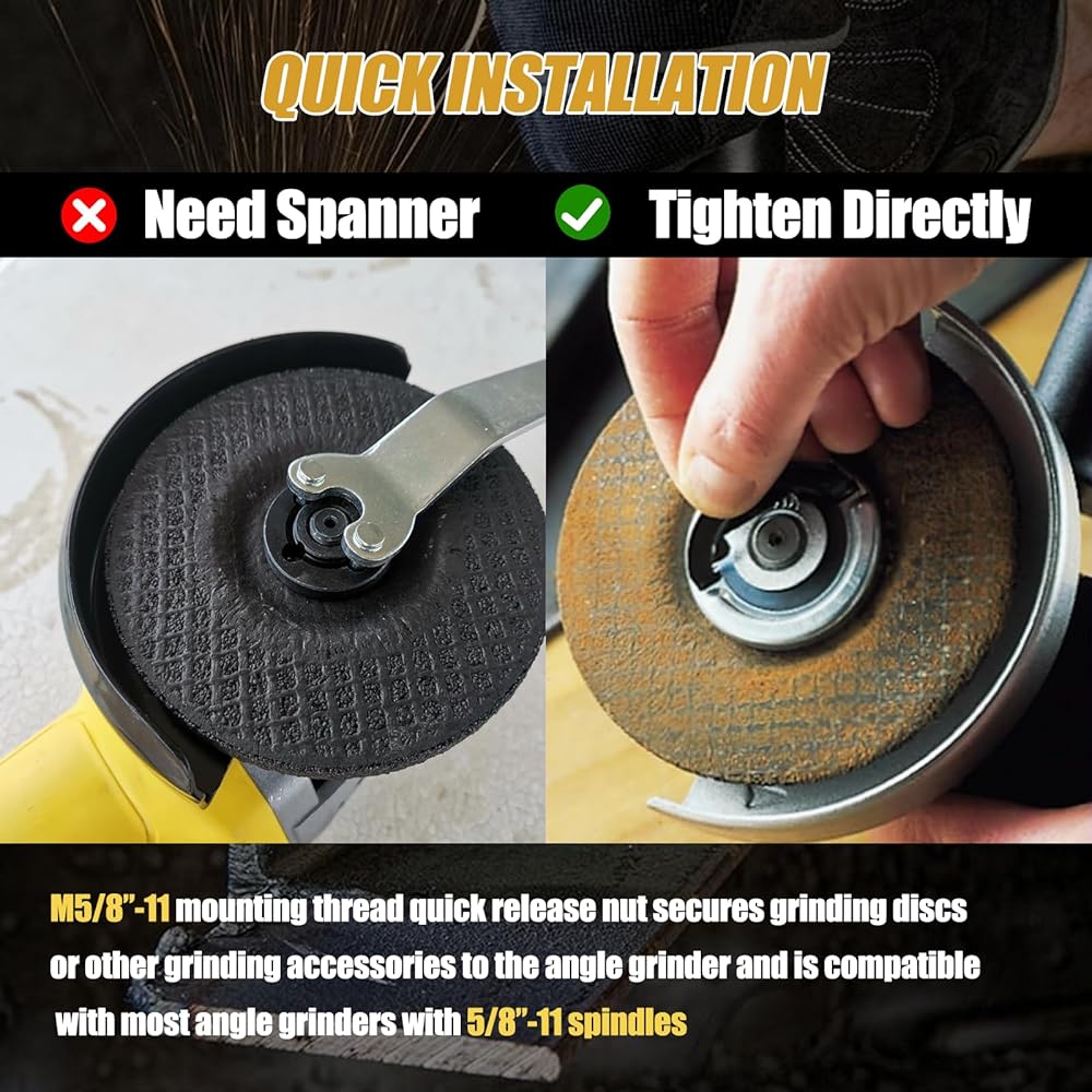 【QUICK INSTALLATION】M5/8”-11 mounting thread quick release nut secures grinding discs or other grinding accessories to the angle grinder and is compatible with most angle grinders with 5/8”-11 spindles. Holds cutting discs in place quickly and easily, no need for spanners or other tools, just tighten it down and use it.