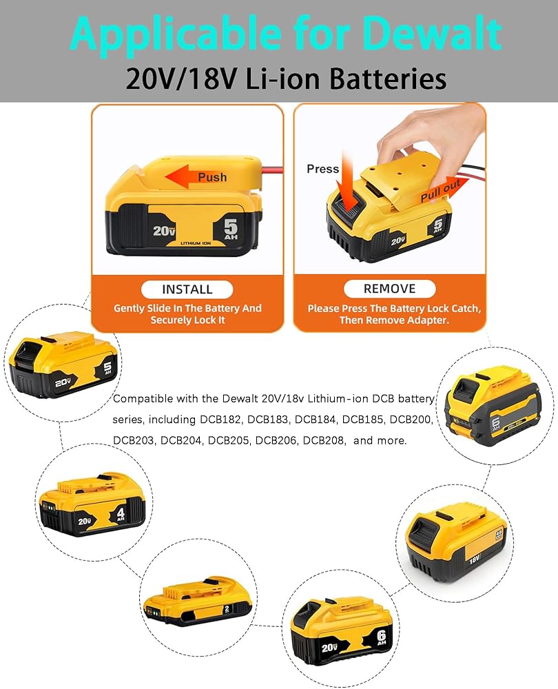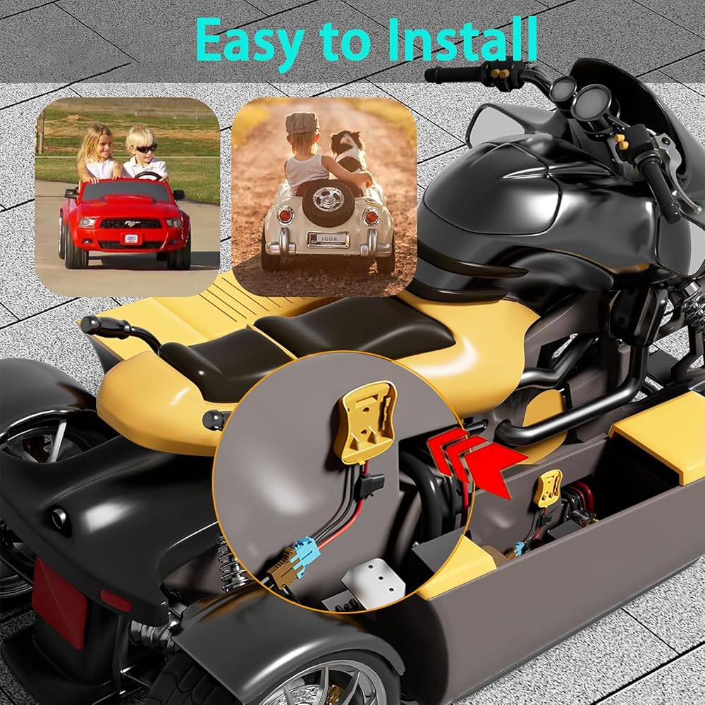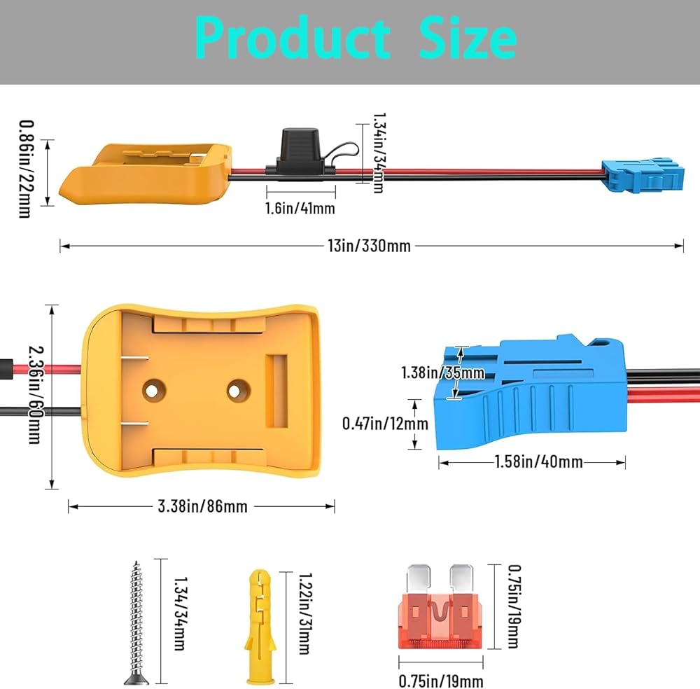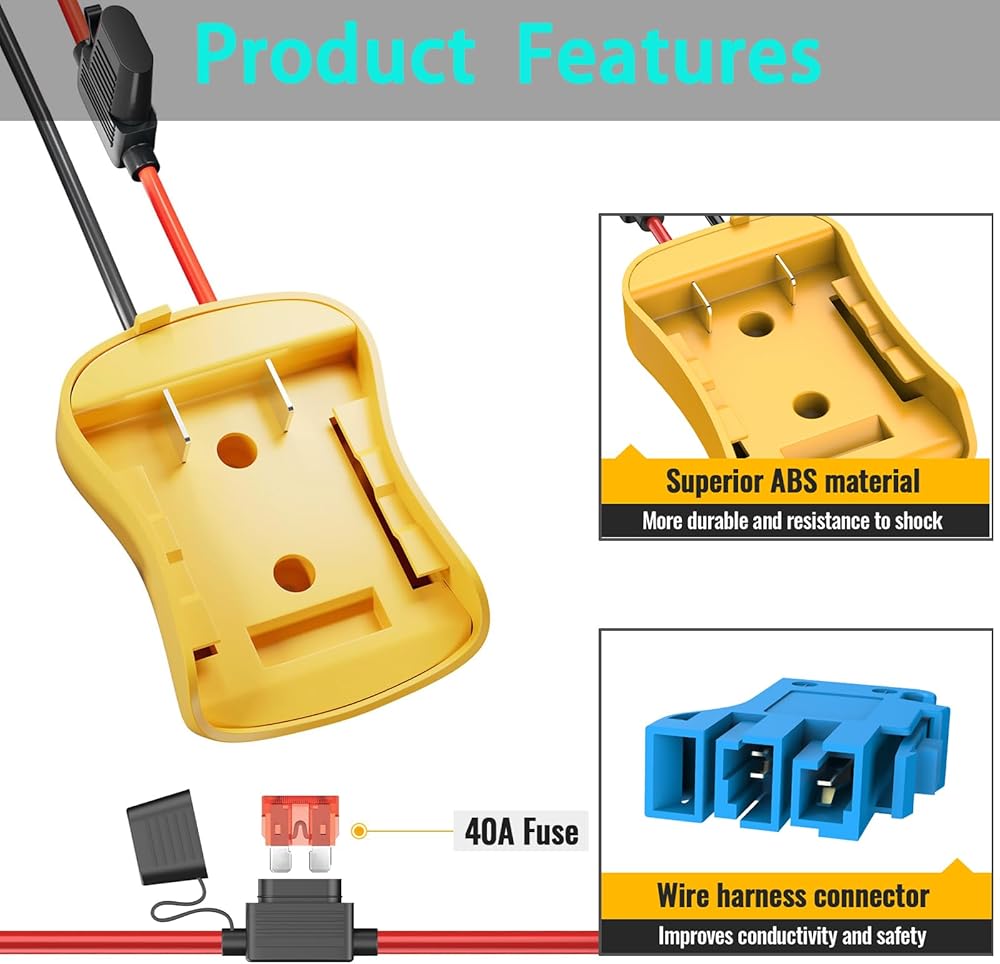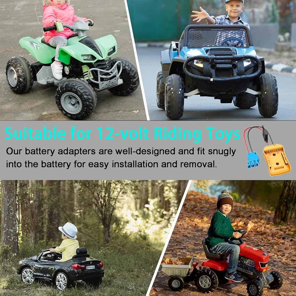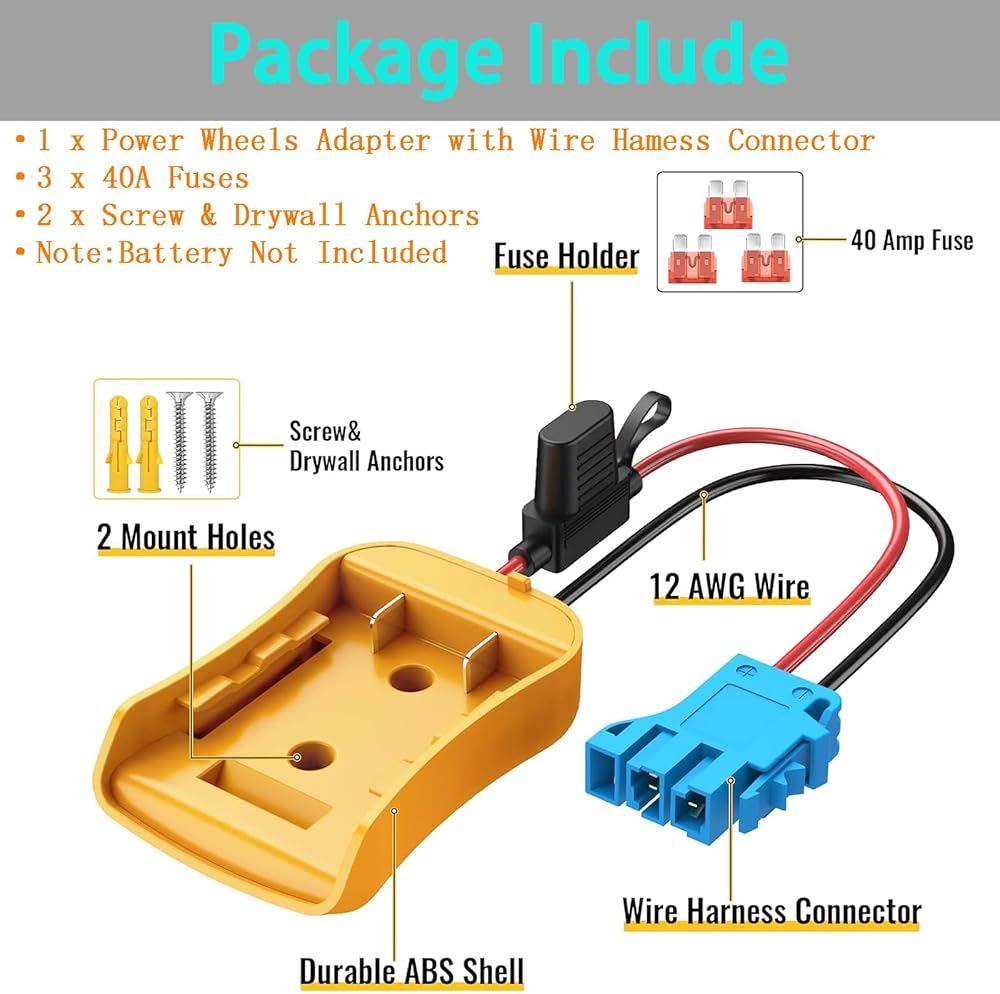Wire Harness Connector Compatible: Perfectly compatible with all Peg-Perego 12-volt ride-on toys, this wire harness connector can safely connect to the standard 12 volt SLA and lithium battery ride on toys.Adapter Compatibility: The 20V power wheel adapter is perfectly compatible with 20V/18VLithium-ion DCB Dewalt series, such as DCB182, DCB183, DCB184, DCB185, DCB200, DCB201, DCB203, DCB204, DCB205, DCB206, DCB208, DCB230, DCB240 and so on.Product Advantage: Power wheel battery adapter is durable and lightweight, and equipped with wire harness connectors and fuse holder for easy connection to the adapter, which is fast and better. Made of high quality ABS plastic, it has excellent resistance to shock, moisture and corrosion.Easy to Use: Power wheels battery adapter gently slide in the battery groove then push adapter and lock securely. lf you want to remove the adaptor from the battery, please press down the buckle of the battery, then remove it. There are 2 screw holes on the adapter can be well fixed to the walls or DIY product.Safety: The power wheel converter with 12 AWG wire and 40A fuse. The thick copper wire improves conductivity and safety, allows large current to make safe use on equipment. And the fuse holder can prevent excessive transient current from damaging the battery and equipment.Note: 1. This power wheels adapter is not a charger, it only outputs the voltage and power directly from your battery. 2. The red wire is connected to the positive terminal, and the black wire is connected to the negative terminal. When using, make sure that the positive and negative wires of the device correspond to the positive and negative wires of the adapter. 3. lf not used for a long time, please be sure to remove the battery from the adapter.