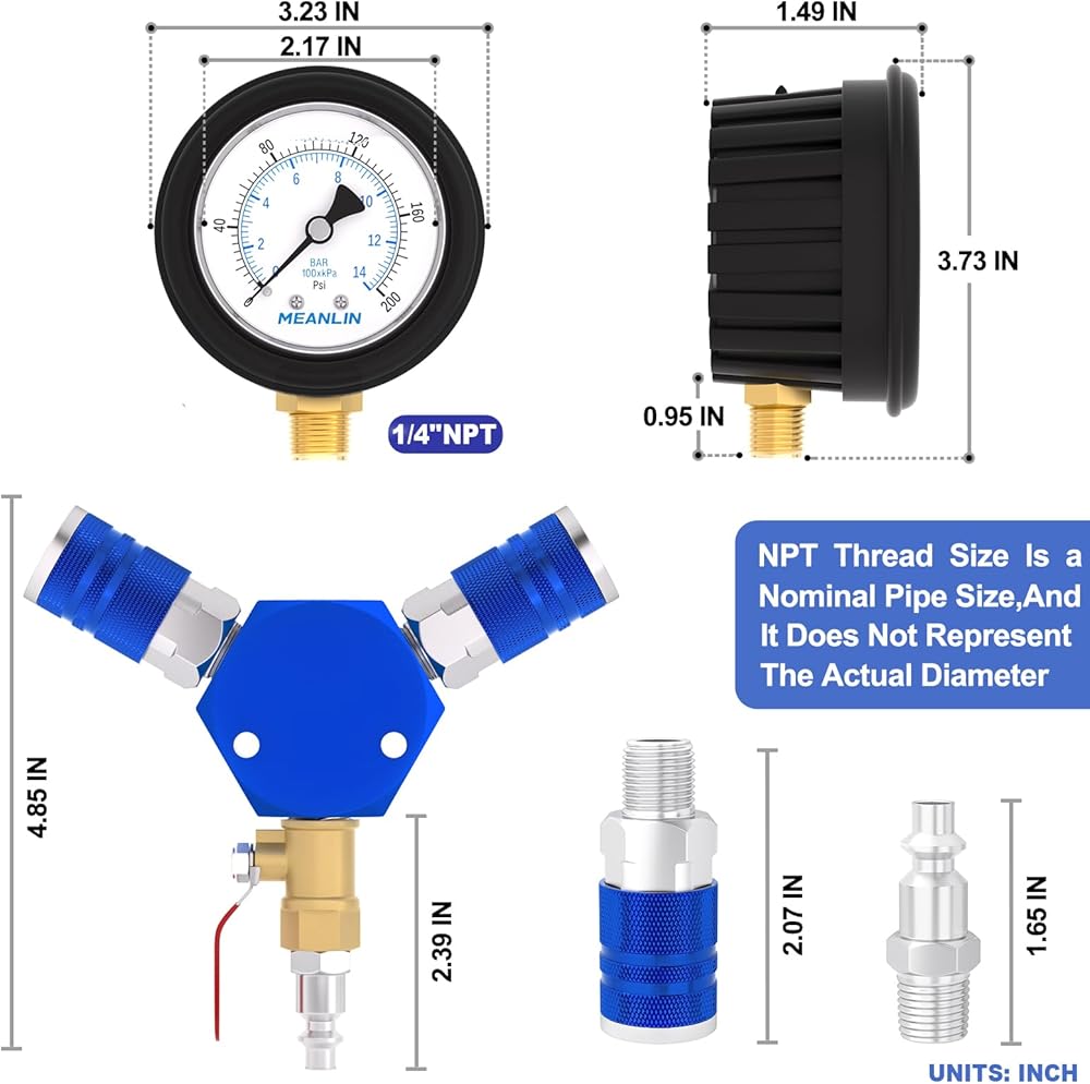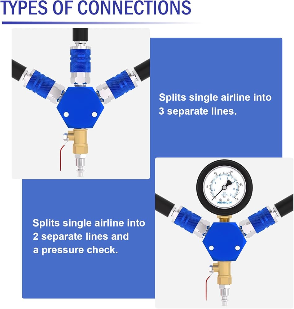 MEANLIN قياس 3-Way مشعب الهواء مع 200 رطل لكل بوصة مربعة قياس الضغط، الألومنيوم الصناعية عرافة تركيبات الاتصال السريع الهواء الخائن لملحقات خرطوم ضاغط الهواء تركيبات الاتصال السريع