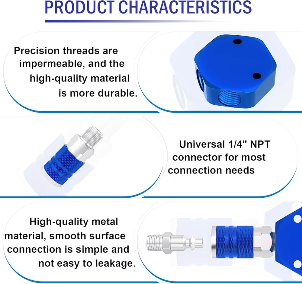 • 【العبوة متضمنة】1* جسم من الألومنيوم، 1* مقياس قرص لـ 1/4 بوصة، 3* قابس هواء حديدي مطلي بالنيكل، 3* وصلة هواء حديدية مطلية بالنيكل، 1* مفتاح إيقاف الصمام، 1* شريط تيفلون