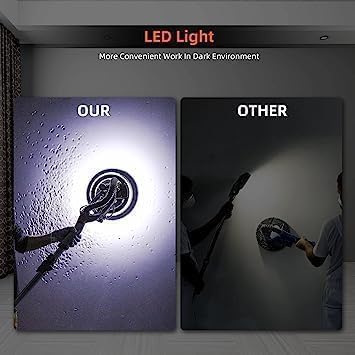 【رؤية محسنة】: مجهزة بأضواء شريطية LED ذات طابقين، تضيء أداة صنفرة الحوائط الجافة منطقة العمل، وتزيل الظلال وتعزز الرؤية، مما يجعل من السهل تحديد العيوب وتحقيق نتائج خالية من العيوب.
