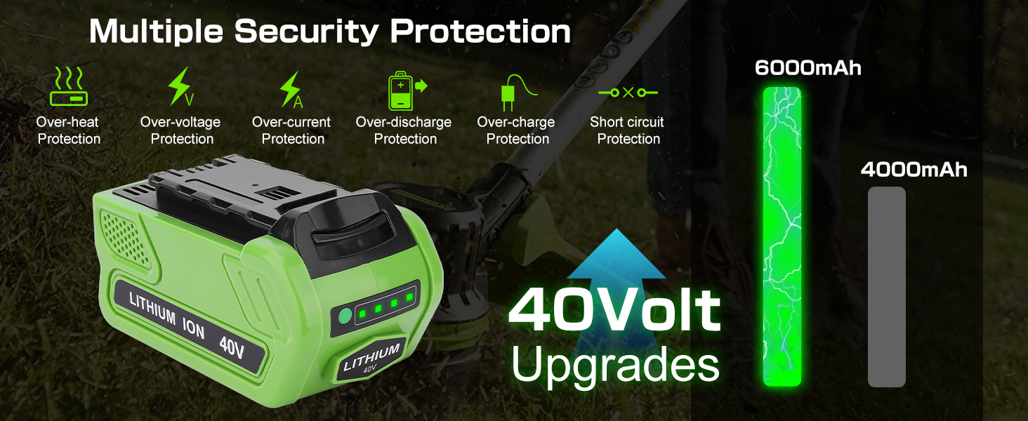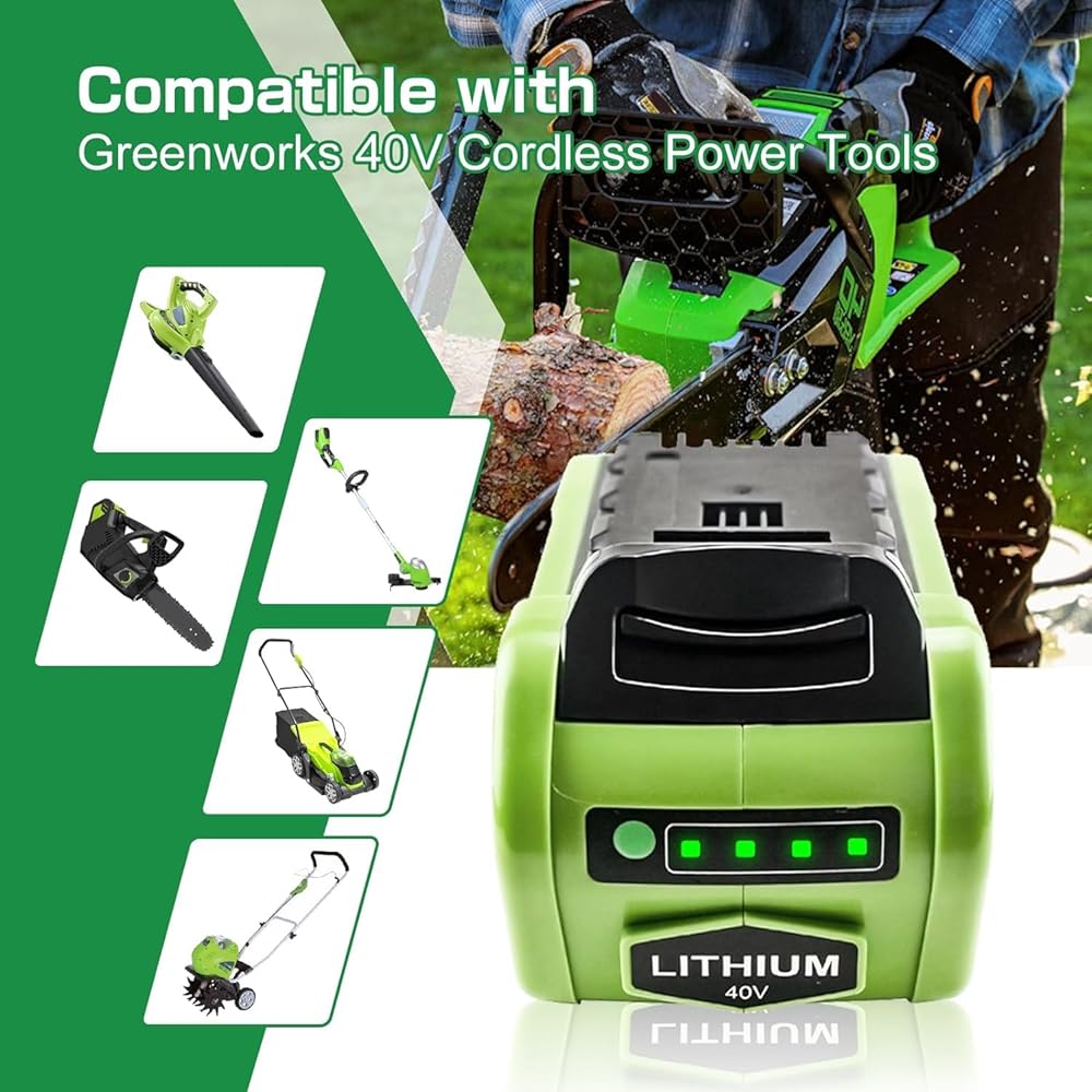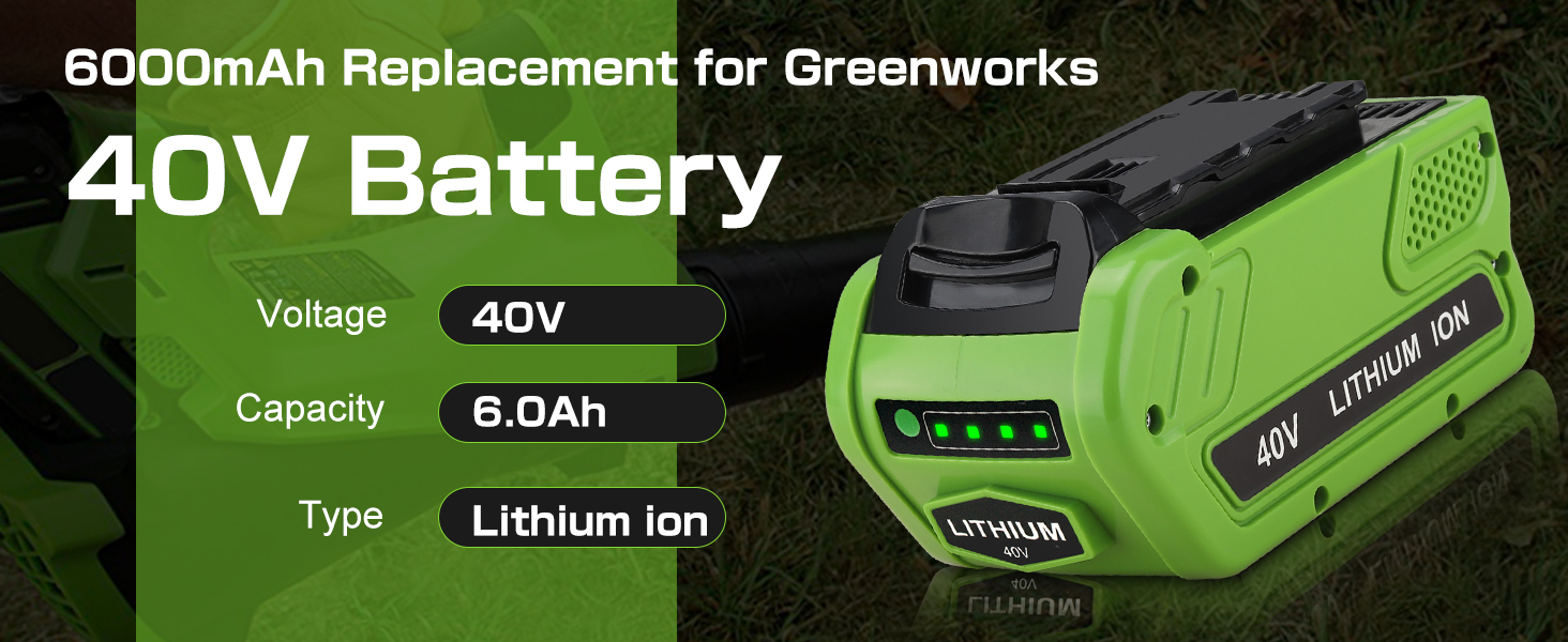 【تفاصيل البطارية】جهد البطارية: 40 فولت | السعة: 6.0 أمبير | نوع البطارية: ليثيوم أيون | توفير أداء أكثر قوة وطويل الأمد لأدوات الطاقة Greenworks 40V G-MAX
