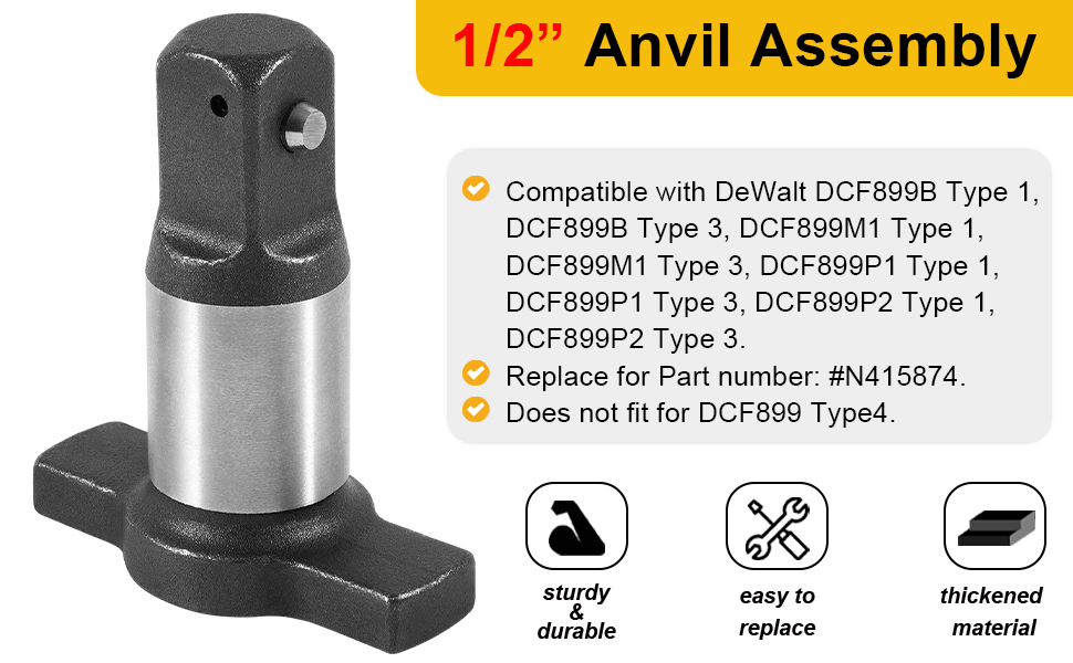 توافق مثالي: سندان مفتاح الربط مقاس 1/2 بوصة متوافق مع DeWalt DCF899B النوع 1، DCF899B النوع 3، DCF899M1 النوع 1، DCF899M1 النوع 3، DCF899P1 النوع 1، DCF899P1 النوع 3، DCF899P2 النوع 1، DCF899P2 النوع 3.