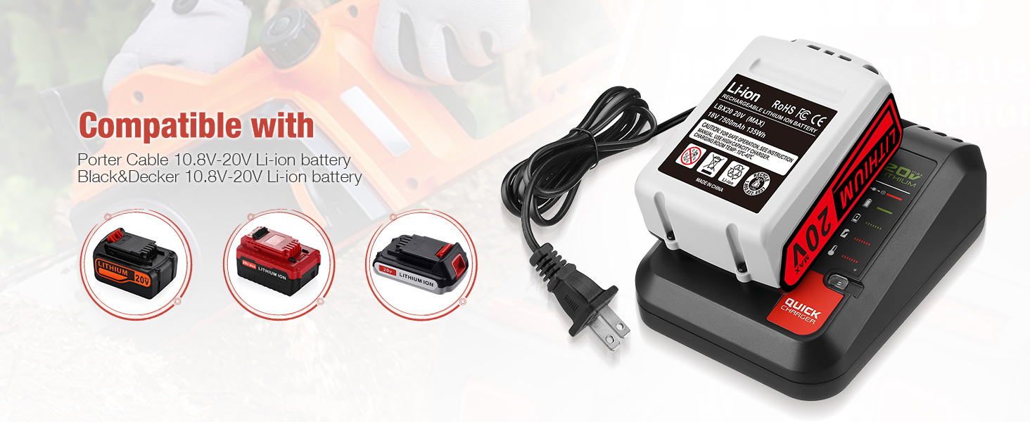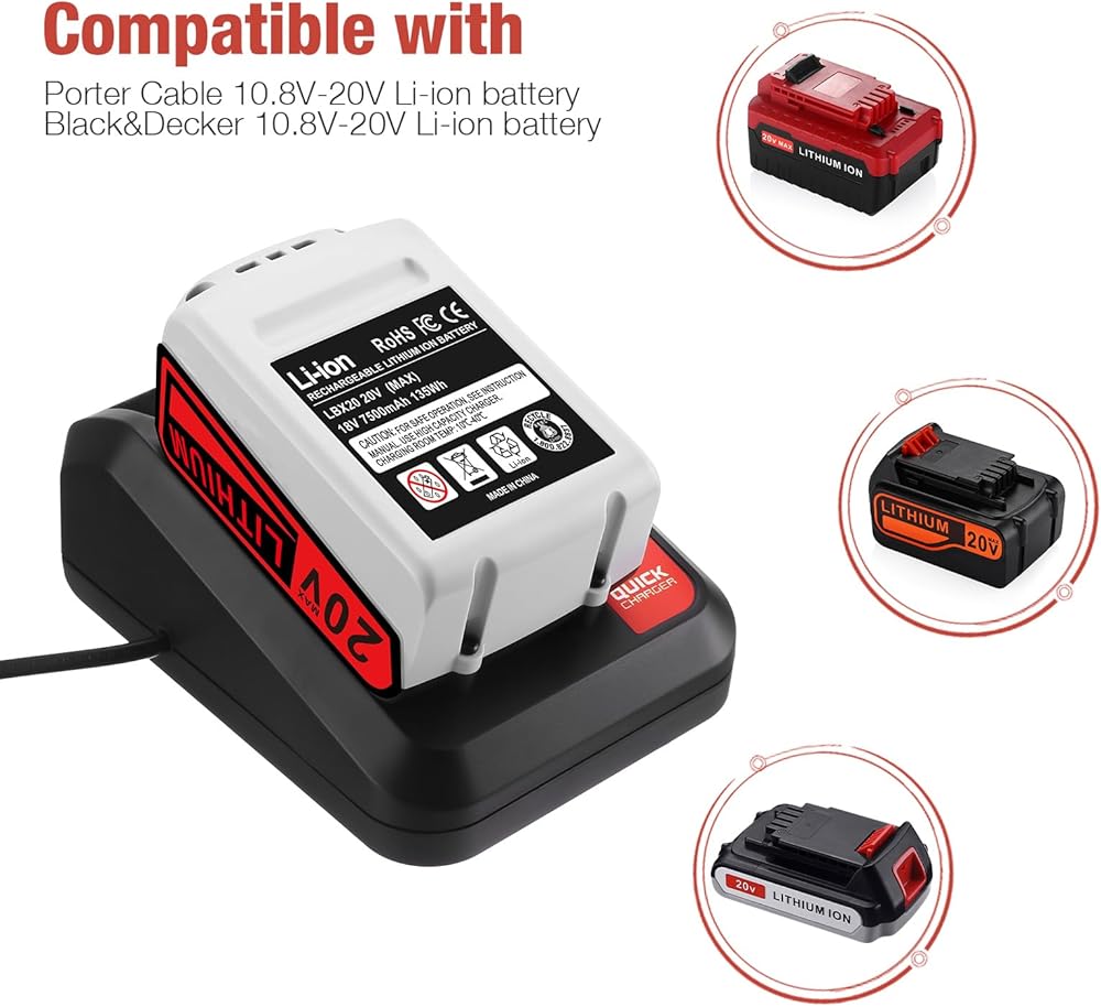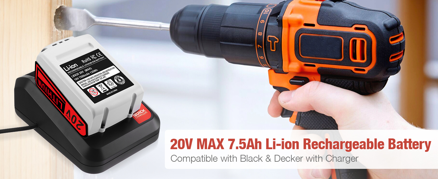 • 【توافق مثالي】نوع البطارية: ليثيوم أيون| الجهد: 20 فولت | السعة: 7500 مللي أمبير. استبدل بطارية الليثيوم بلاك آند ديكر 20 فولت LB20، LBX20، LBXR20، LBXR2020، LB2X4020-OPE، LBXR20B-2؛ تعمل بشكل كامل مع أدوات الطاقة اللاسلكية لبطارية بلاك ديكر 20 فولت.