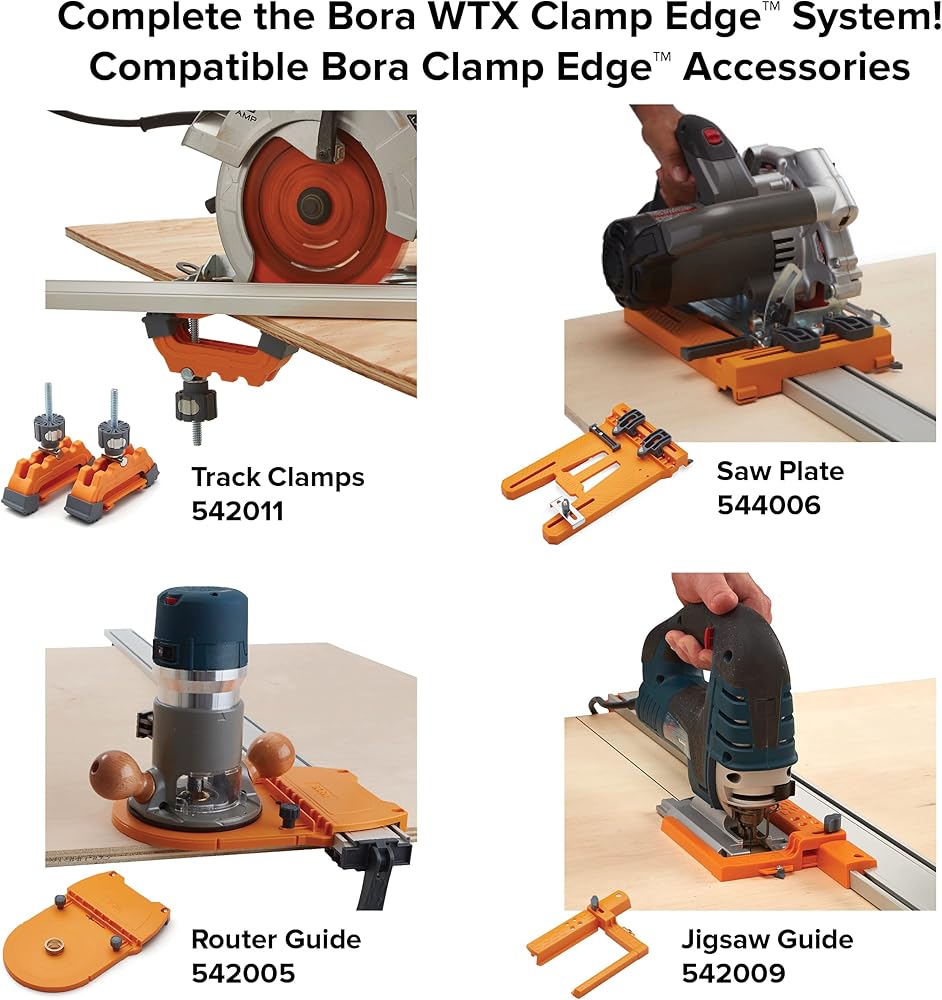 • Additional Accessories: The BORA WTX Saw Guide System has additional accessories including the Saw Plate, Track Clamps for cutting any angle, and the Router Guide