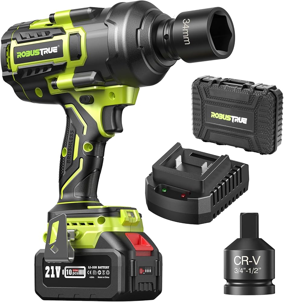 مفتاح ربط تأثير 2000N.m عزم دوران عالٍ، 3/4 إلى 1/2 مسدس تأثير بدون فرش، مفتاح ربط تأثير لاسلكي 1500 قدم رطل بطارية 5.0AH، شاحن سريع، مفتاح ربط كهربائي للشاحنة الثقيلة RV