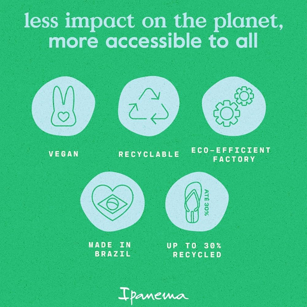 نباتي وصديق للبيئة: جميع أحذية Ipanema نباتية، وقابلة لإعادة التدوير بنسبة 100%، ومصنوعة من مواد معاد تدويرها قبل الاستهلاك بنسبة تصل إلى 30%، وتم تصنيعها في البرازيل. تعمل مصانعنا ذات الكفاءة البيئية بدون أي نفايات من خلال استخدامنا لأجهزة الهضم الحيوي، وتقع المسؤولية الاجتماعية والبيئية في طليعة عملياتنا.