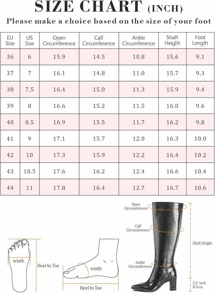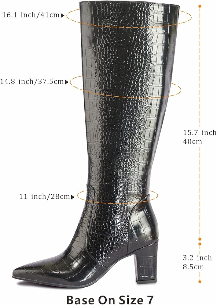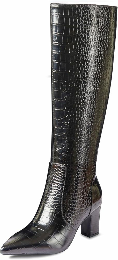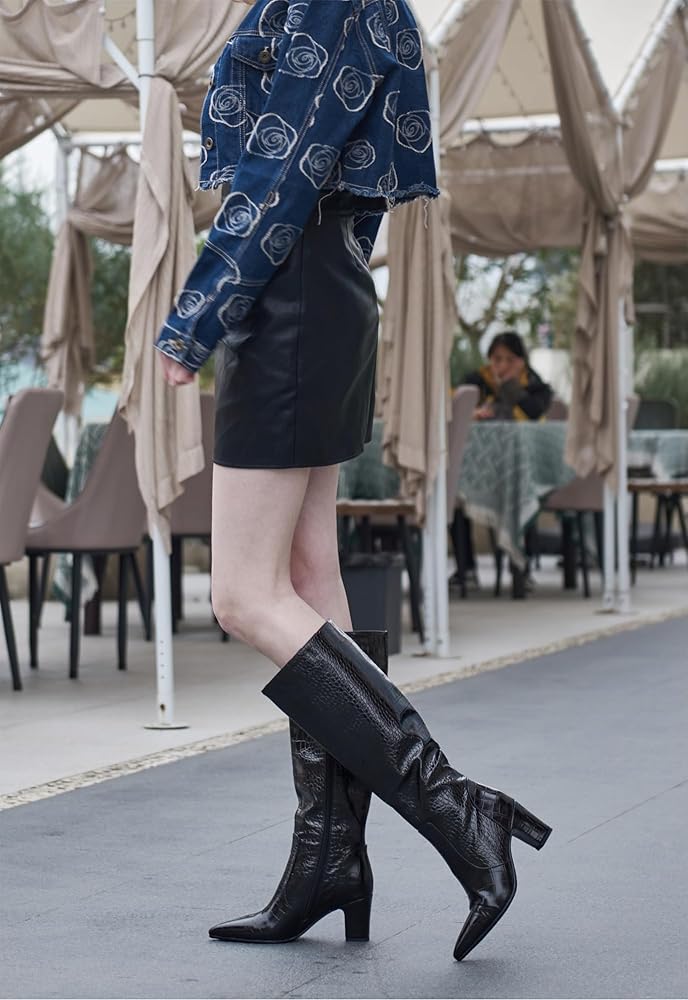 أحذية عصرية فوق الركبة: تصل هذه الأحذية الطويلة التي طال انتظارها إلى أسفل الركبة مباشرةً، مما يعرض تصميمًا أنيقًا مدببًا عند أصابع القدم. يمكن ارتداؤها مع الجلد الصناعي بنمط التمساح اللافت للنظر، مع الفساتين والتنانير والسراويل الضيقة والأزياء المختلفة لإضفاء مظهر عصري.