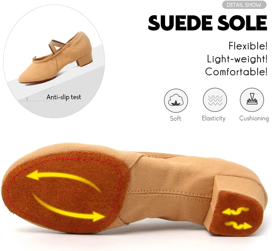 • ☀ الكعب: النعل الخارجي مقسم بكعب منخفض، يتوفر نعل من الجلد السويدي والمطاط، مرن وغير قابل للانزلاق، وهو مناسب لاحتياجات الرقص في الأماكن المغلقة والأنشطة الخارجية.
